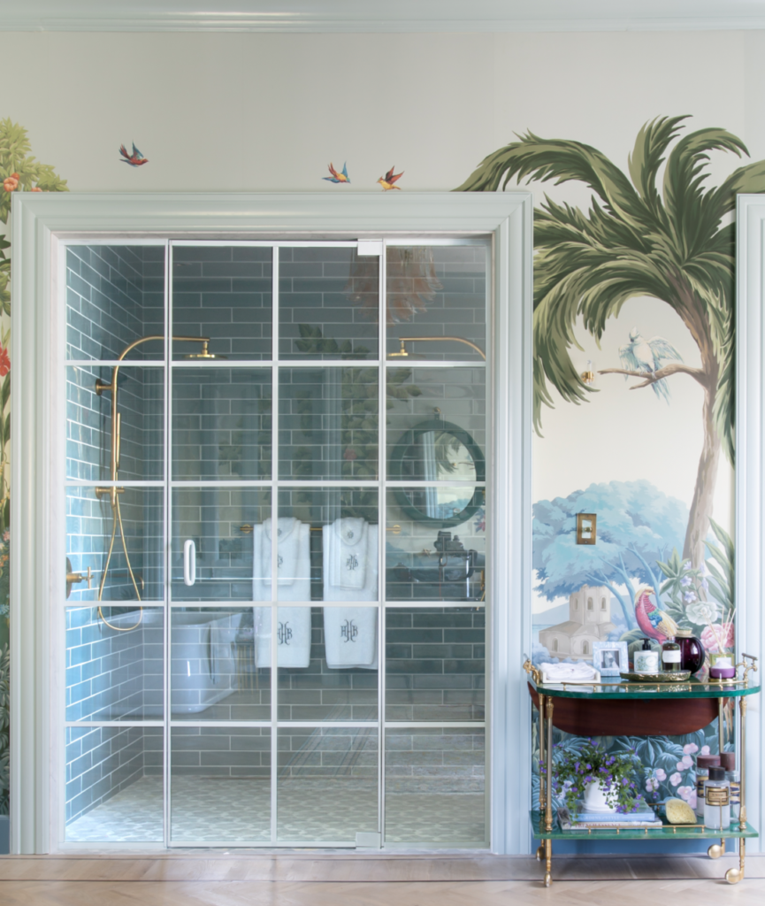 The master bath at Le Petit Trianon features custom de Gournay wallpaper called "Paradise Lost," which was launched this spring in collaboration with ABH Interiors. Julia Berger's hand towels are also visible in the room. (Photo by Suzanna Scott)