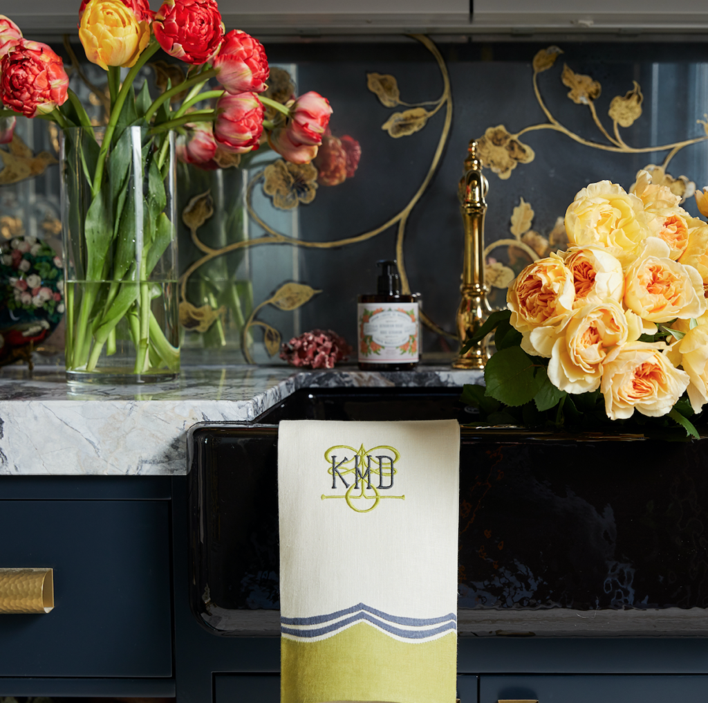 Julia Berger's handmade linens are featured in several rooms at the San Francisco design exhibition, including the butler pantry designed by Kari McIntosh. Berger says she wanted to include a "show-stopping linen towel...draped over the sink." (Photo by John Merkl)