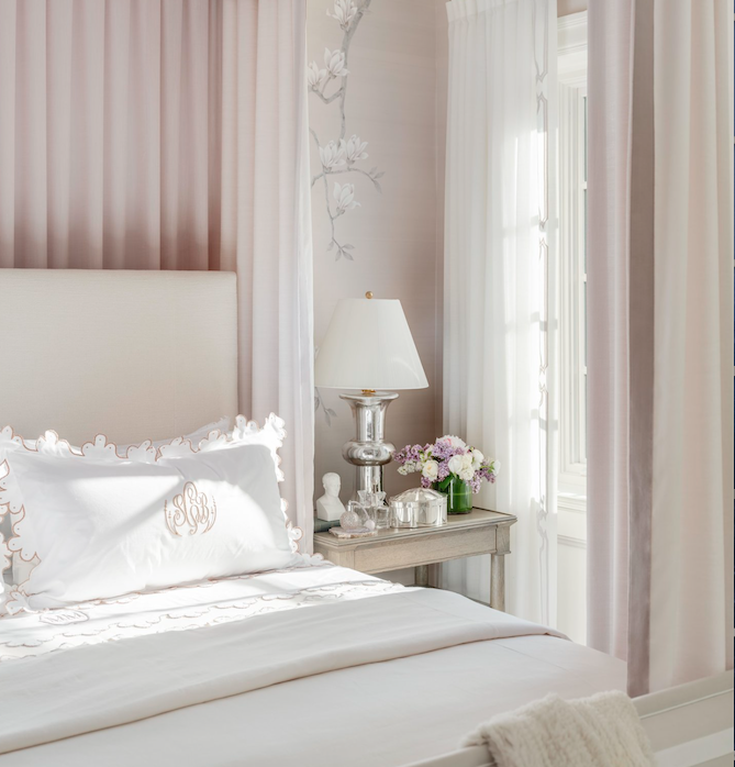 Julia Berger's collection, Julia B Handmade linens, blends elegant modern styles with traditional aesthetics and fabrication practices. Made from the best linen sources available, the designs are ornamented by artisan embroiderers. (Interior Design by Dina Bandman Interiors. Photo by Christopher Stark)