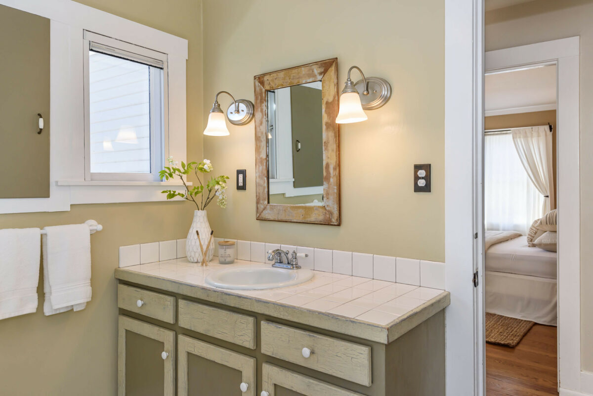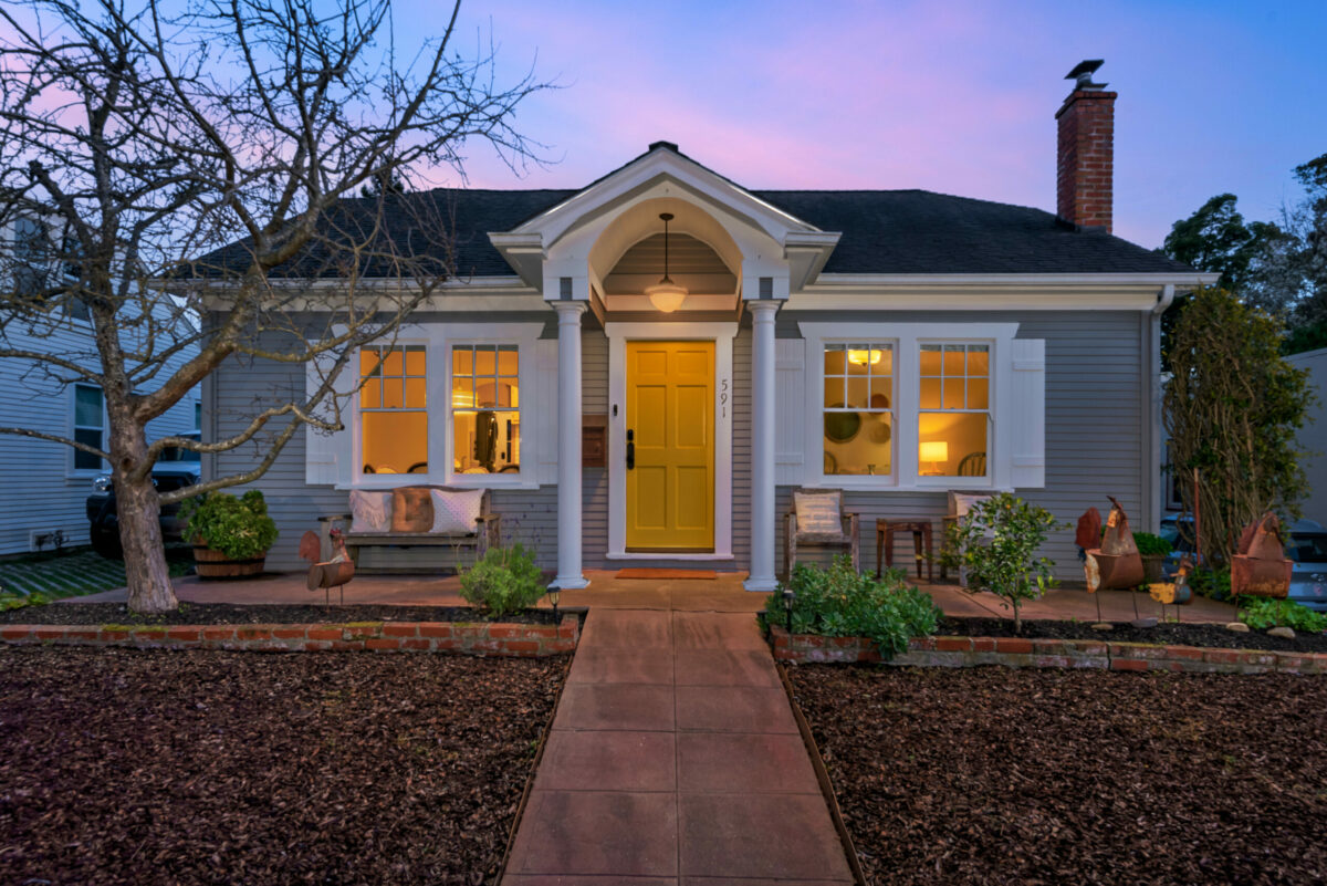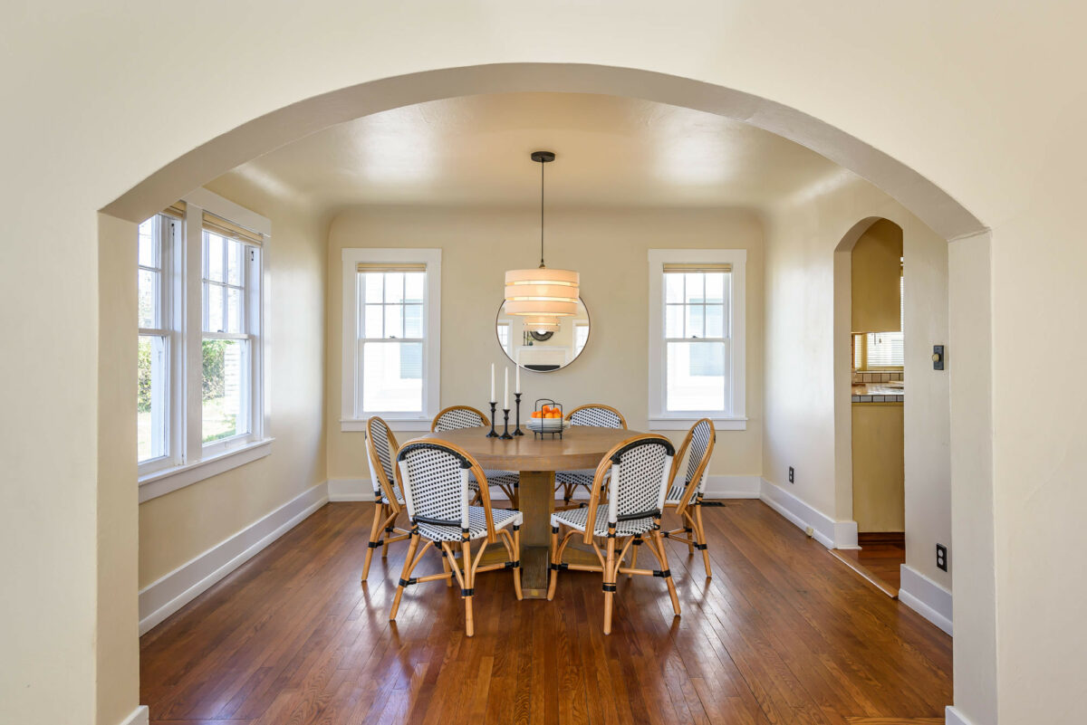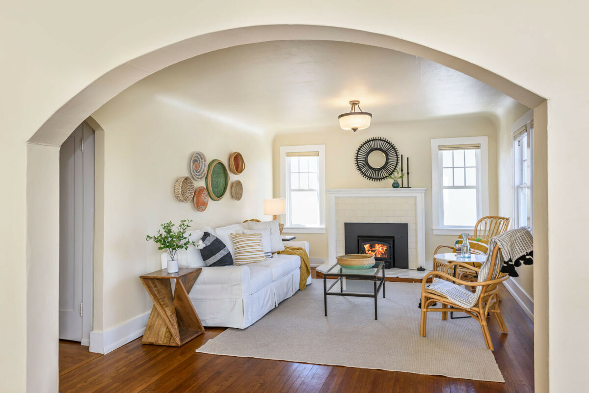 The two-bedroom, one-bath bungalow at 591 Kent St. features signature design elements of the early 1900s — arched doorways, original oak floors, rubbed bronze fixtures. Walls in warm hues and pared down styling create a sense of spaciousness in the 1,017-square-foot dwelling. The simplicity allows the architectural details to shine, while modern light fixtures accentuate the vintage backdrop.