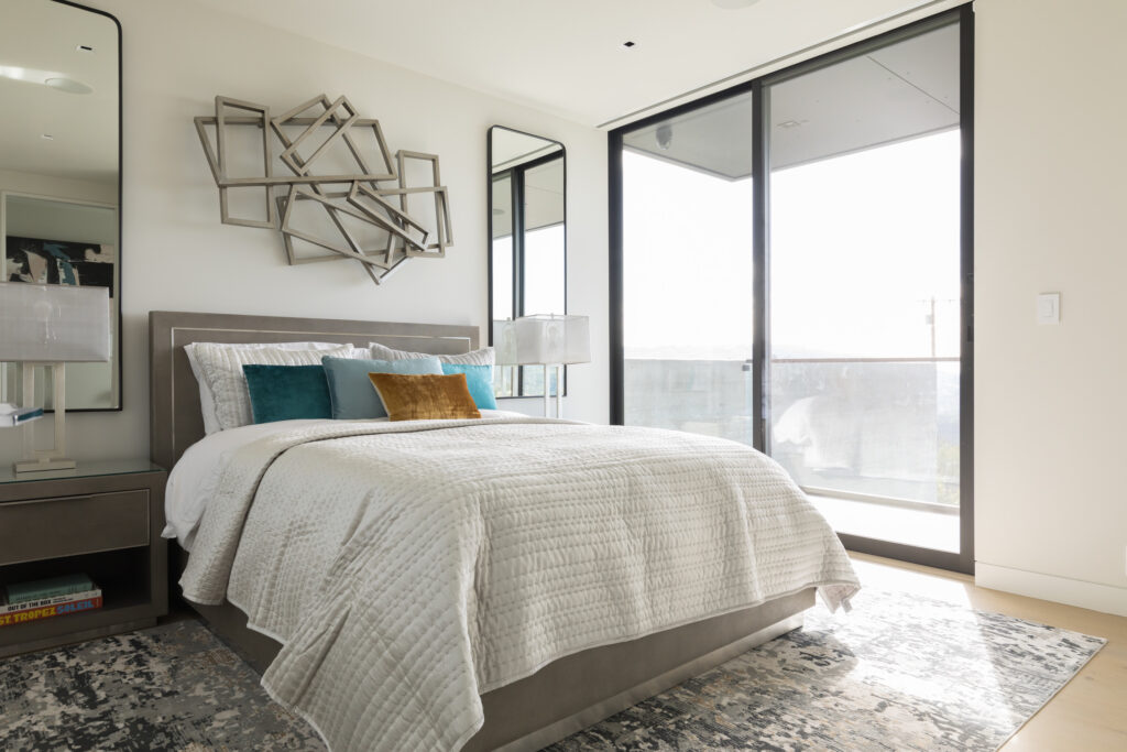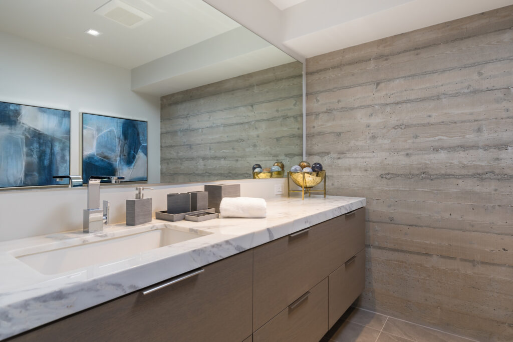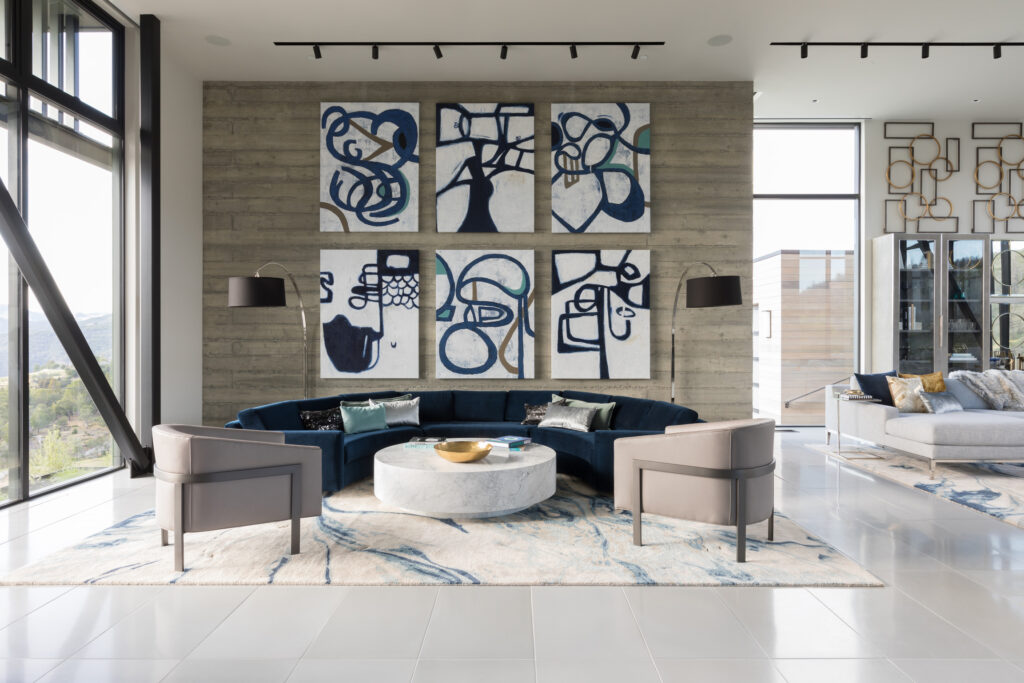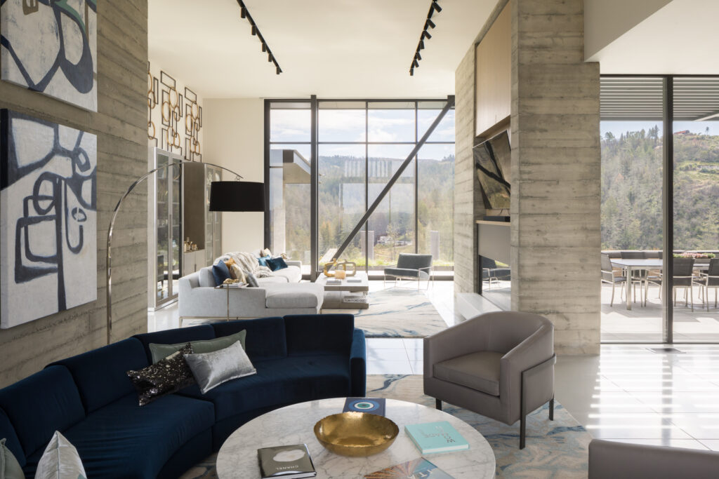 The open concept floor plan connects the kitchen, dining and lounging areas and sets the stage for casual living. Elegant modern furniture pieces and geometric lighting designs cap off the look and infuse sophistication into the less-is-more look.