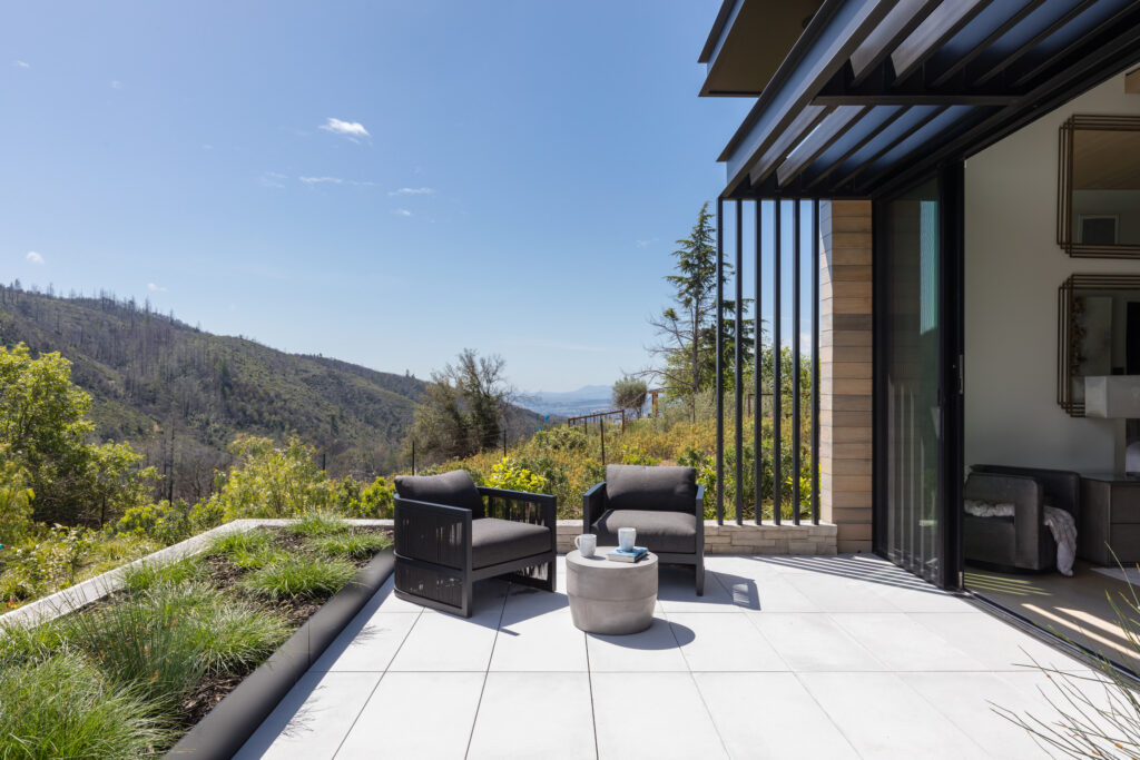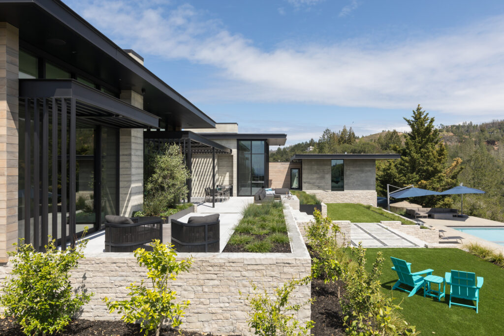The expansive yard has a rectangular pool that mirrors all the angles of the home. The theme of blues continues outside via a similar subtle use color: pillows on the outdoor sofa, and two aqua-colored Adirondaks which provide a playful splash of vivid color. The landscaping is dotted with plants placed in fire-resistant “islands.”