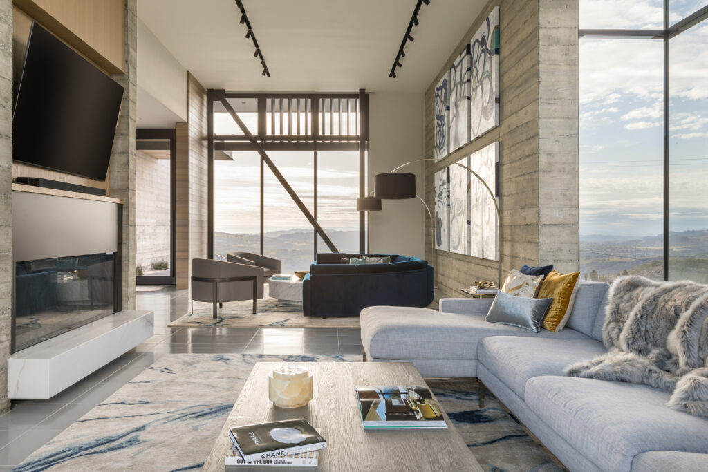 The 3,700-square-foot home has three bedrooms and four bathrooms, plus an additional structure of 1,500 square feet. The dwelling sits on 2.2 acres and is listed for $7,650,000. Clean lines compose this modern home, which has true floor-to-ceiling windows that pocket into the wall in the great room for “seamless indoor-outdoor living” and great views.