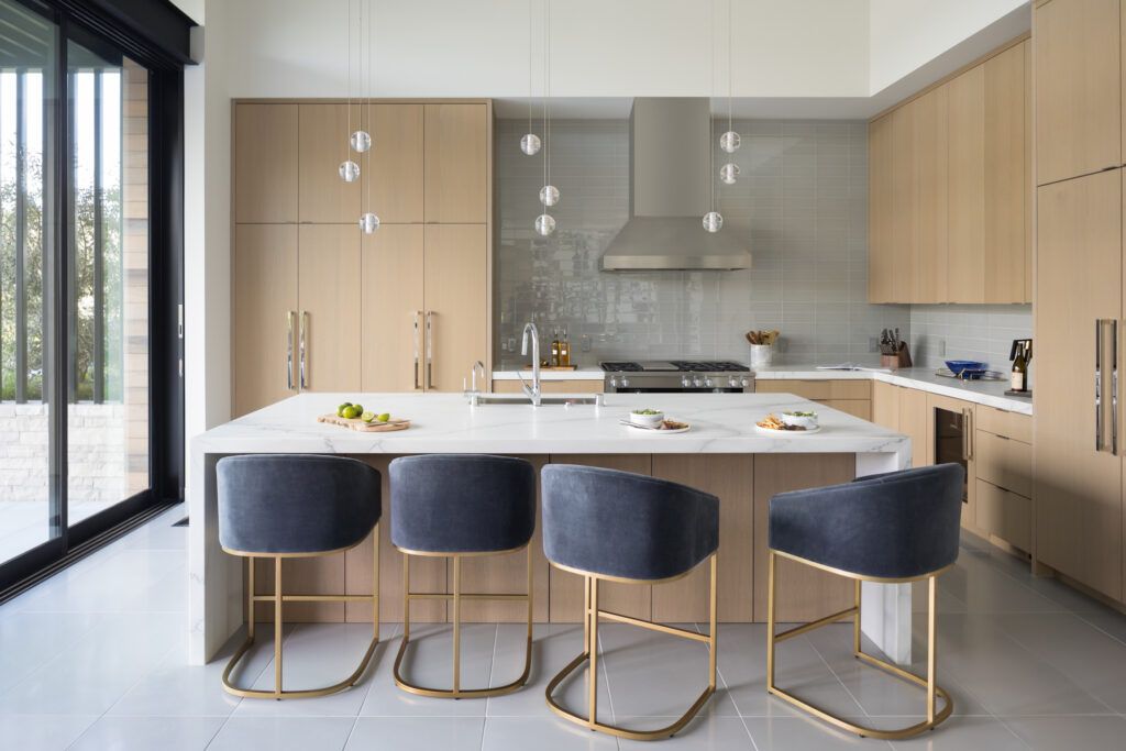 Color is kept to a minimum with gray walls and tonal cabinets. Subtle shades of blues are infused with restraint through textiles and art. Warmth is introduced in the palette through small details like gold framing on chairs and the occasional satiny pillow.