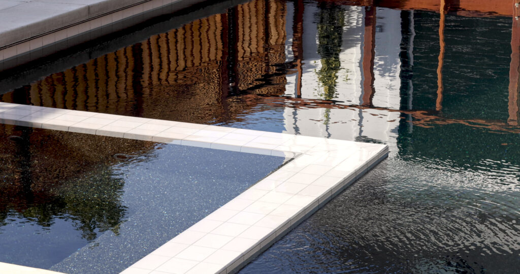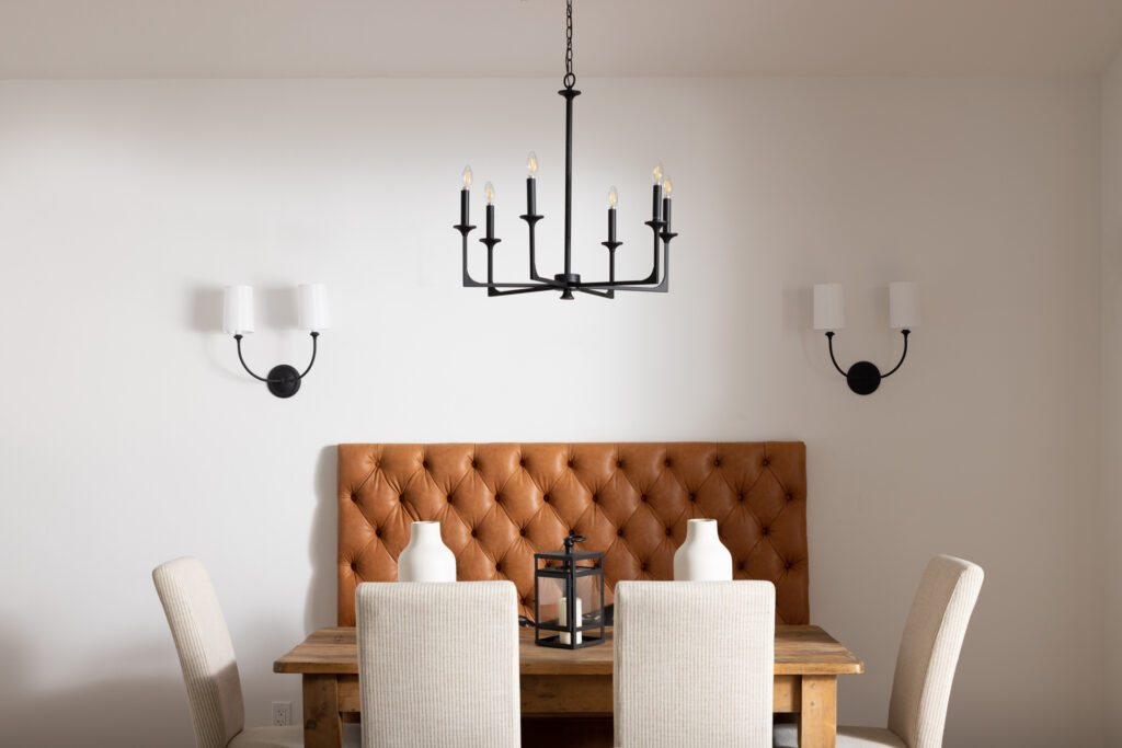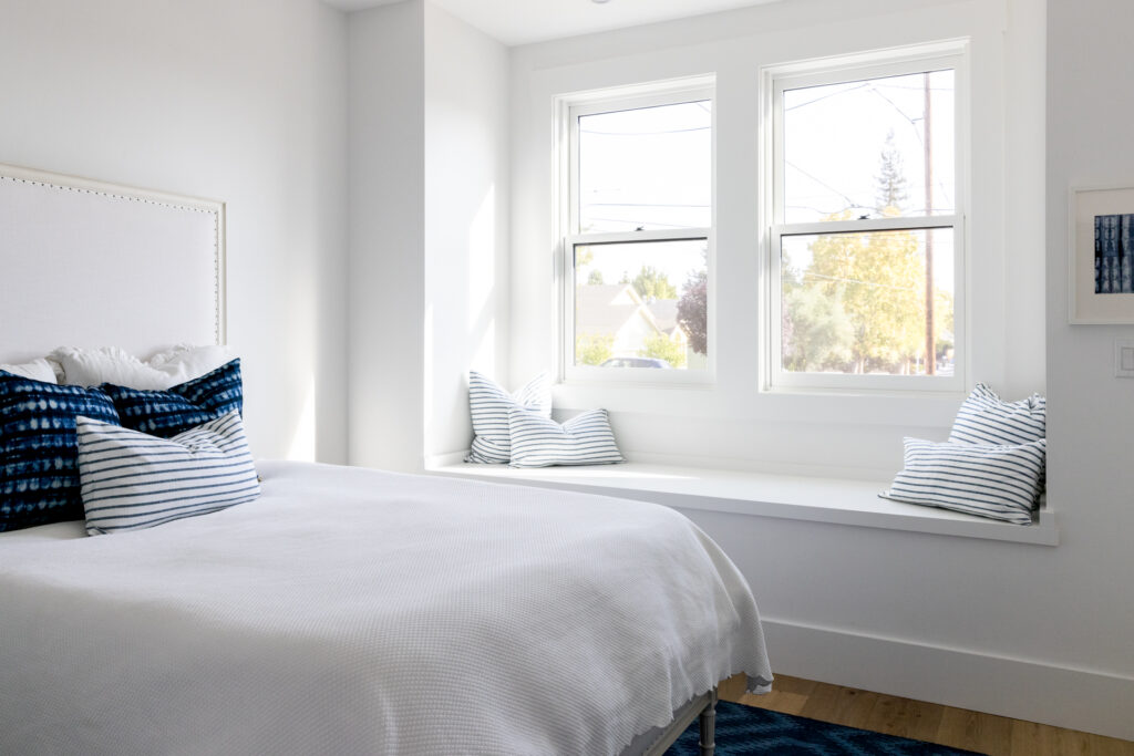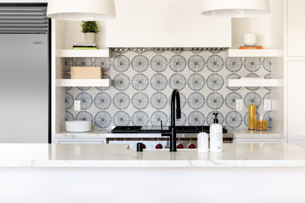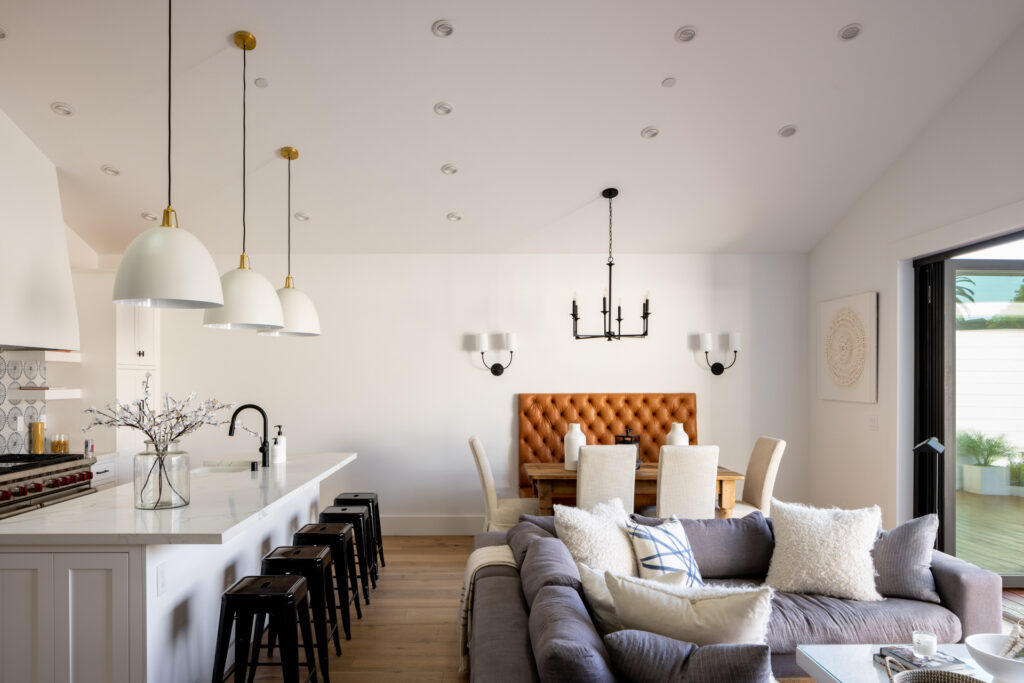 A vaulted ceiling in the open-concept kitchen-living room area creates a sense of airiness, while indoor and outdoor spaces blend together in a way that is very popular these days. Sliding glass doors that pocket into the wall add to the sense of openness, as do the white-painted walls — styling details like a lucite desk have an almost disappearing effect. Black accents and a few decorative elements add interest to the otherwise white color palette: a warm leather bench, blue tiles, black fixtures and subtle color in the cabinetry, for example.