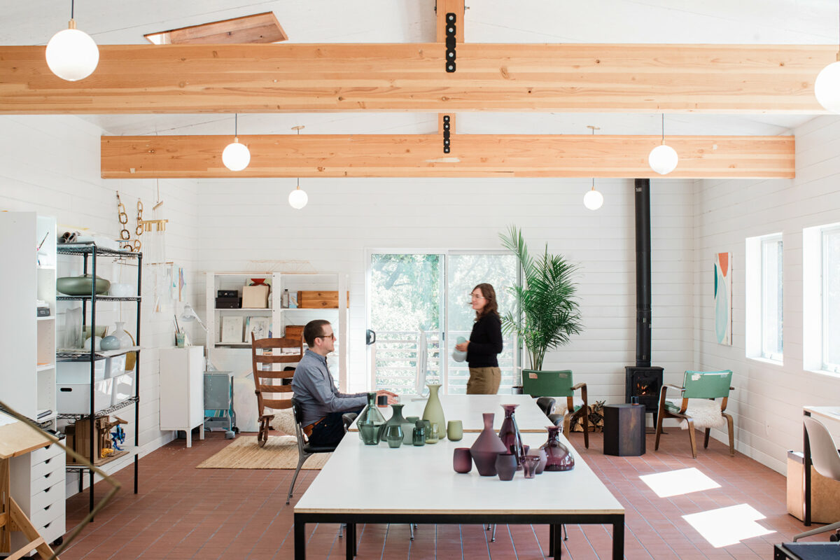 Karen and Paul’s workshop and design studio is just across the courtyard from the main home. It is a functional, barn-like space with tile floors and space for drawing, prototyping, and metalwork. (Eileen Roche/For Sonoma Magazine)