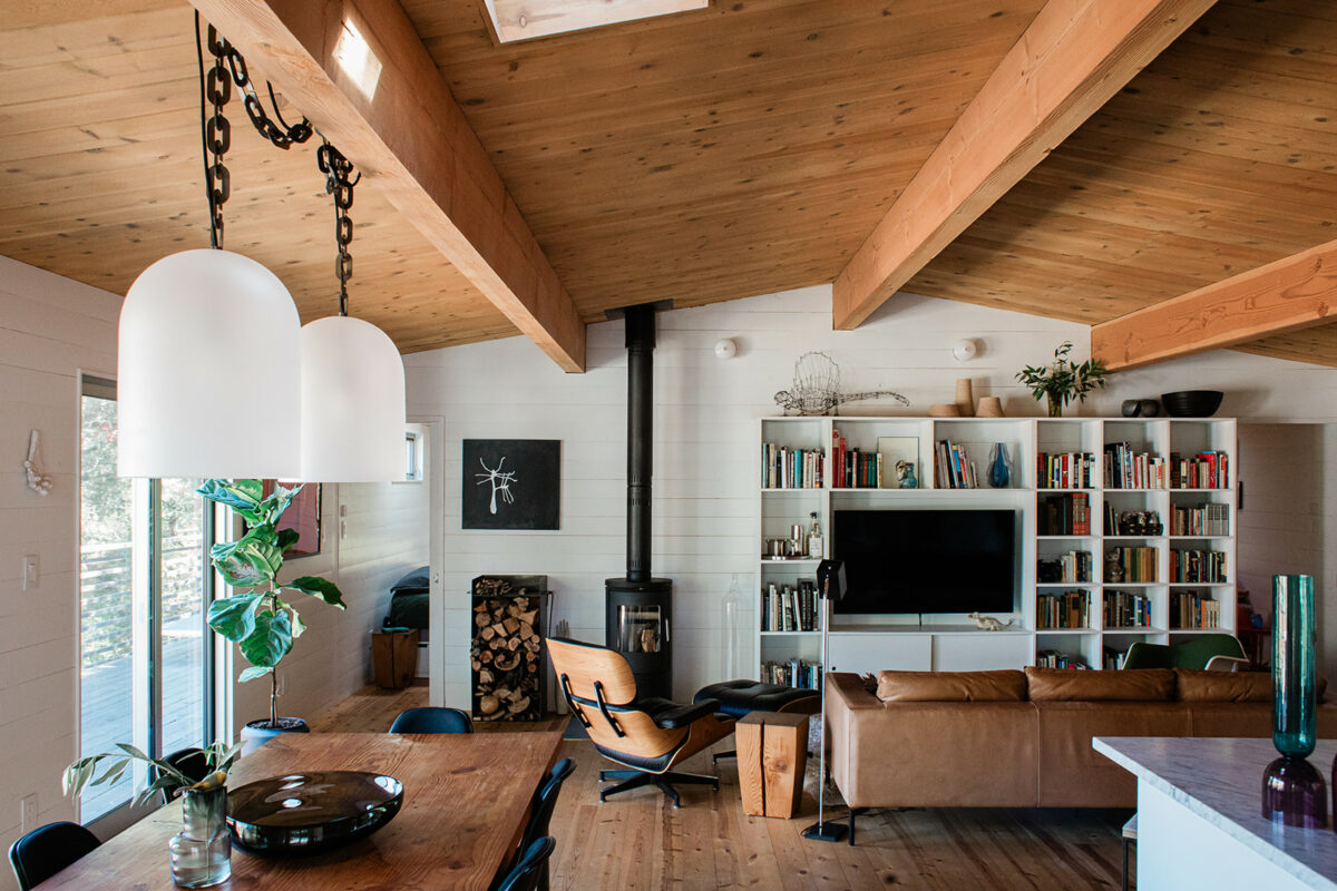 Intentionally, the redwood siding on the exterior is untreated, and the interior floors are treated simply with tung oil. There’s no drywall anywhere, no polyurethane sealants, no window coverings to separate the home from the outdoors.