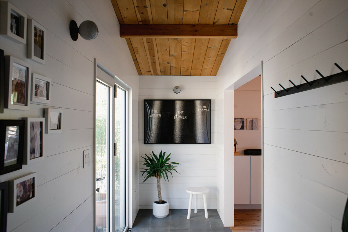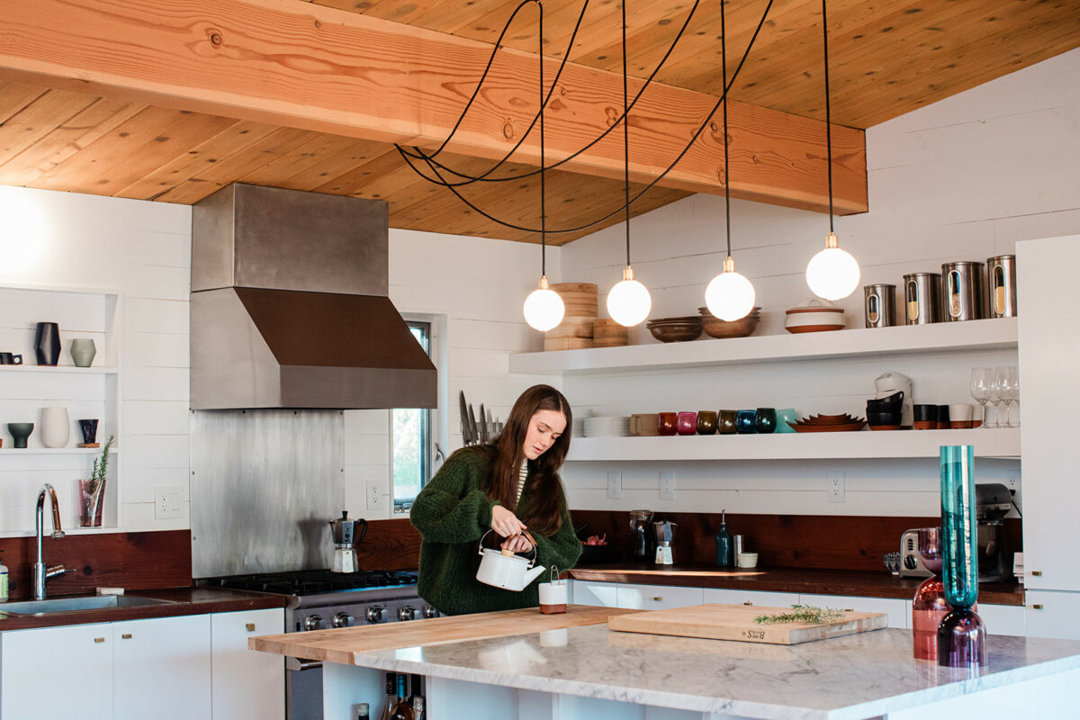 The simplicity of the home in all of its seasons remains at the heart of what the family loves about living here. This time of year, there’s always someone in the kitchen, often heating up water for tea or starting a batch of soup. Lola puts on headphones and wanders under the oak trees, lost in an audiobook. They hear deer rustling in the leaves down by the creek, sometimes in the middle of the night. And the early winter light is especially resonant, pouring in through the windows to warm the home indoors and out.