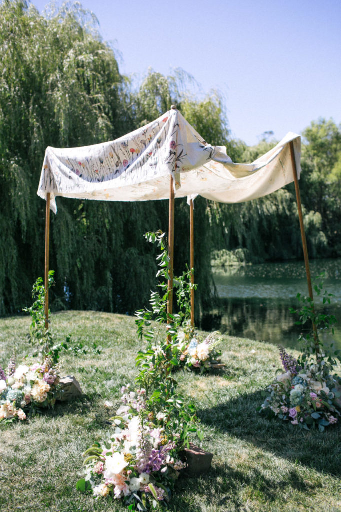 Getting married under a chuppah in a traditional Jewish ceremony was important to Berkeley residents Elliott Rector, an attorney, and Allegra Poggio, an art production director. They chose a canvas chuppah printed with wildflowers as a central symbol of their wedding last July. It represents four open walls, explains Elliott. “Your house is temporal. You don’t need your physical structure to have your home. You are the home.”