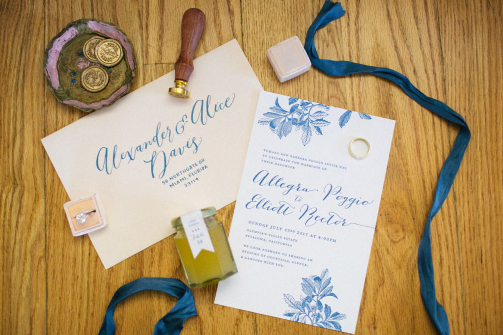 The ceremony was led by a progressive rabbi from Berkeley who was recommended to them by the rabbi at the conservative Portland synagogue in which Elliott was raised. The ceremony included changes that reflected the couple’s shared spiritual values. Allegra, whose family is Catholic, said her vows in Italian, and instead of the bride circling the groom seven times, they chose to circle each other.