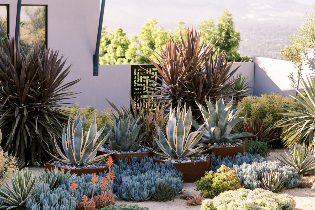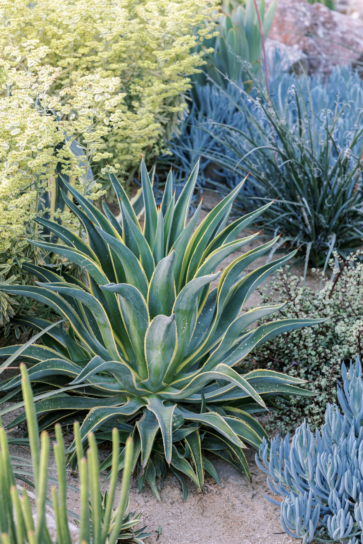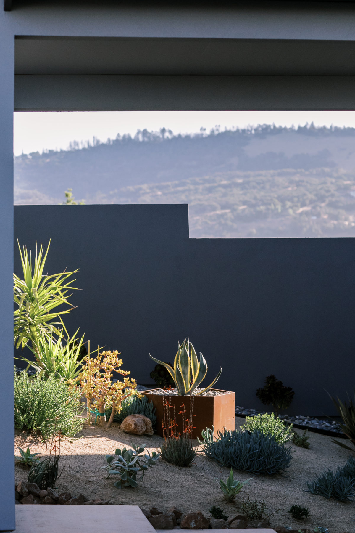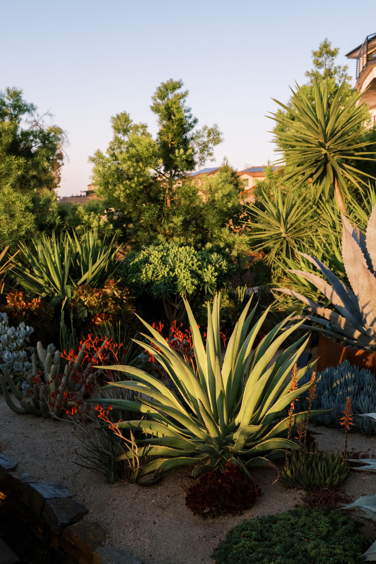 The sand-like decomposed granite Lisa sourced for the new yard was a more expensive choice for ground covering, but also helps resist fire. So does the colorful plant palette of aeoniums, agaves, yuccas, euphorbias, and other succulents. Once established, succulents need much less irrigation and are resistant to heat, sun, and wind.