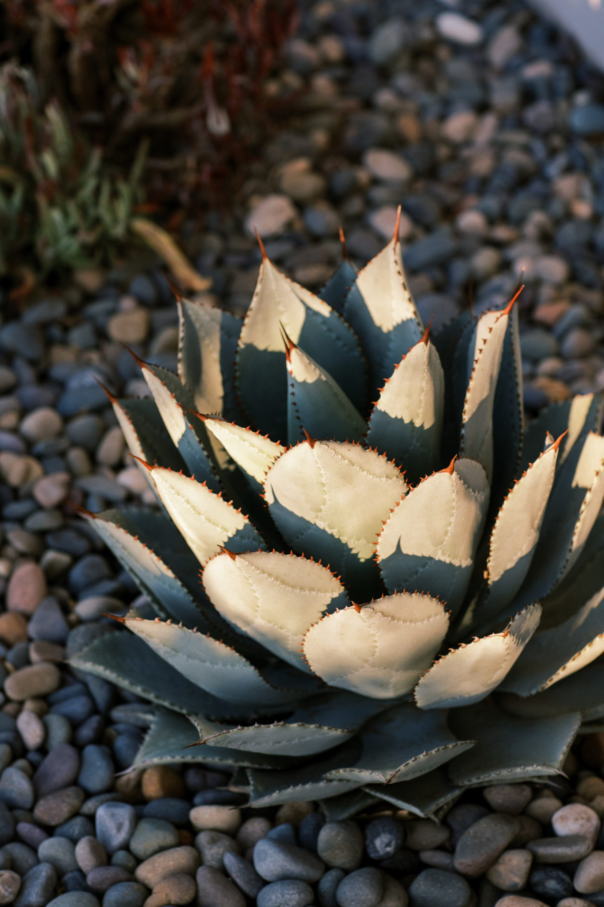 A single agave specimen, photographed from above, shows off the plant’s gorgeous symmetry. The Mattsons chose tumbled stones for groundcover along the side of the house for fire safety. (Eileen Roche)