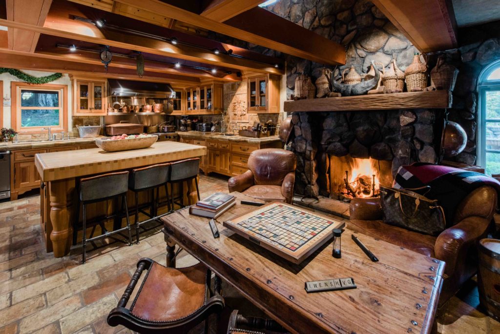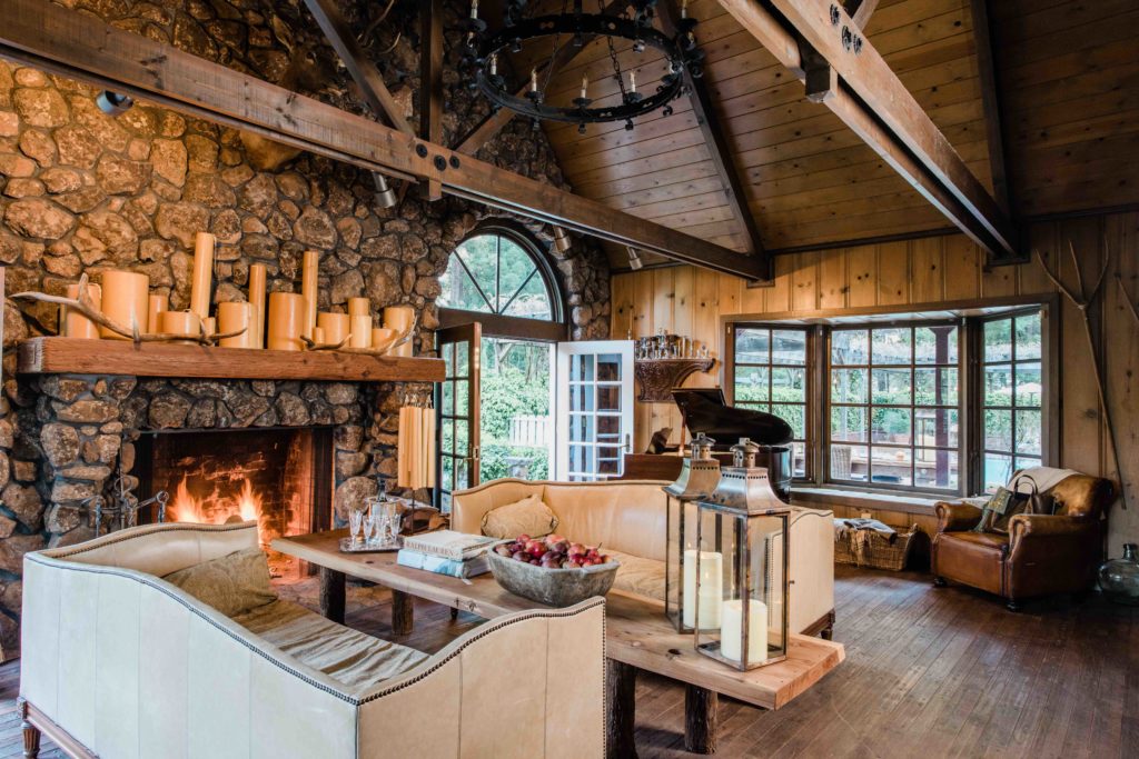 A massive two-story fieldstone fireplace anchors the great room, flanked by a pair of deep French-country couches bought secondhand. The mantelpiece is home to a collage of chunky beeswax candles Barbara bought 30 years ago from a small shop in Santa Rosa.