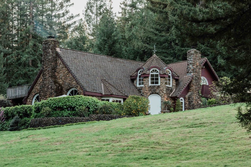 Outside, a pool and broad brick patio fill out the backyard, while in the front, stone walls Frank built surround a garden and cafe tables. Low boxwood hedges and fig and olive trees bring in more greenery. A short walk down the hill, there’s a stunning natural amphitheater of redwoods tucked into the slope.