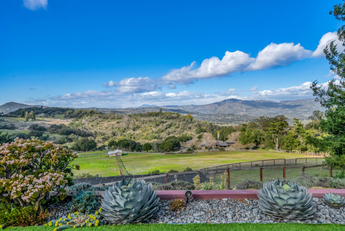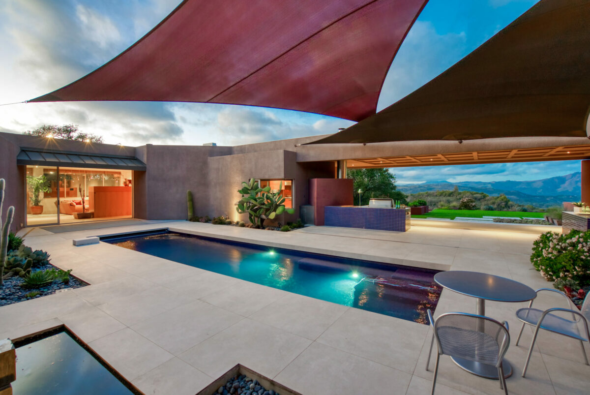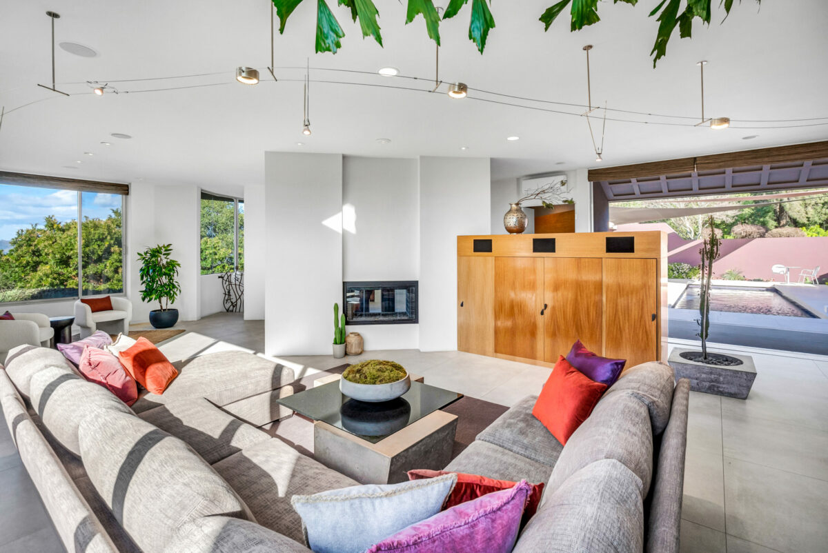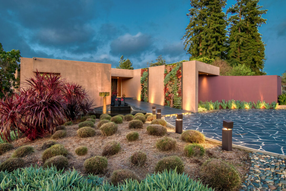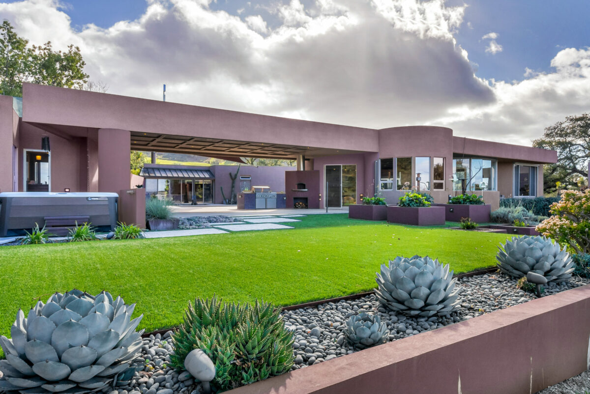 More artistic design elements can be found throughout the home. The main bedroom has built-in cabinetry with graceful crane-like brass lighting fixtures. The library offers a handsome grid of shelving and a rolling ladder. There’s a meditation room and natural stone bathrooms. More tranquility-inducing elements are found in the yard’s modern fountains and pool area. Artfully placed large succulents and agave plants, along with manzanita and oak trees, create lush patterns in the landscape.