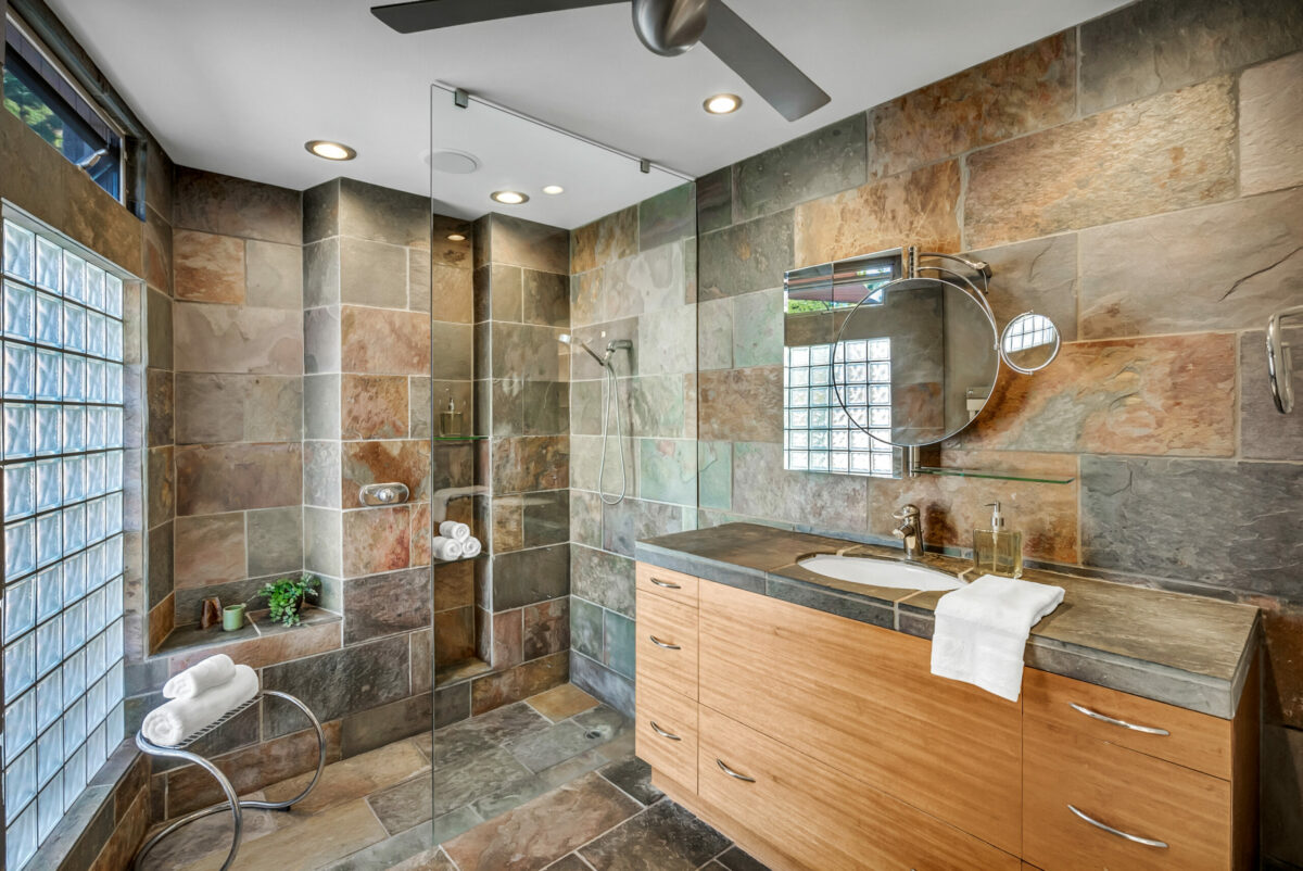 Perched on a 56-acre lot on Sonoma Mountain, this modern estate resembles a piece of functional art. Designed by Santa Rosa architect Robert Zinkhan, it features rounded corners, earthy hues that blend into the hillside and a playful mix of geometric patterns.