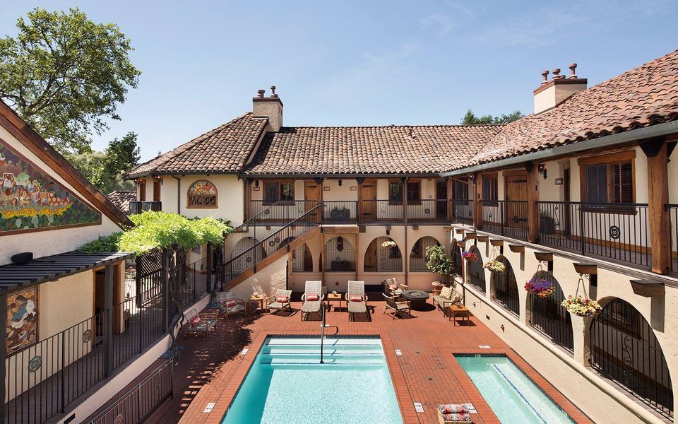 Rancho Caymus Inn, Rutherford: The pool and hot tub serve as the centerpiece at this Spanish hacienda-style inn. The pool is the ideal spot to view Grape Harvest, a mosaic mural by Guillermo Wagner Granizo. The pool is for guests only. 1140 Rutherford Road, Rutherford, 707-200-9300, ranchocaymusinn.com (Courtesy of Rancho Caymus Inn)