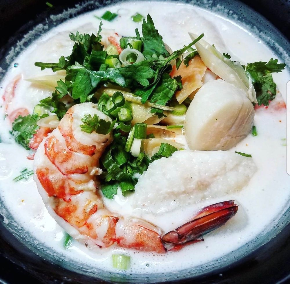 Tom Yum Goog Nam Khon, a spicy, creamy sour shrimp soup with gulf prawn, tomato, mushrooms, coconut milk, galangal and Thai herbs, at Khom Loi in Sebastopol. (Heather Irwin/Sonoma Magazine)