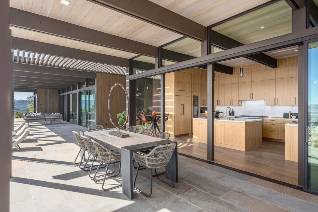 Landscape by San Francisco-based Arterra Landscape Architects consists of a few plantings chosen for water conservation and fire resistance, according to Martin. The design allows the natural rocky setting to take center stage, while bits of greenery have been added for a subtle sense of lushness. A few rocky outcroppings frame the views and take on the presence of abstract art.