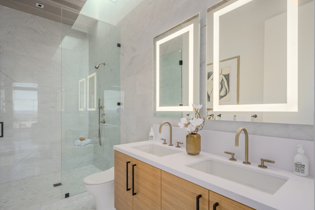 The design impact manages to be both strong and subtle. A simply designed cabinet gains its warmth through the rich white oak it’s made from. Calacatta and statuary marbles provide natural but bold accents in the bathrooms and kitchen. Floor-to-ceiling windows just can’t fail on this lot. The sky views at the top of the hill have a dreamy up-in-the-clouds feel.