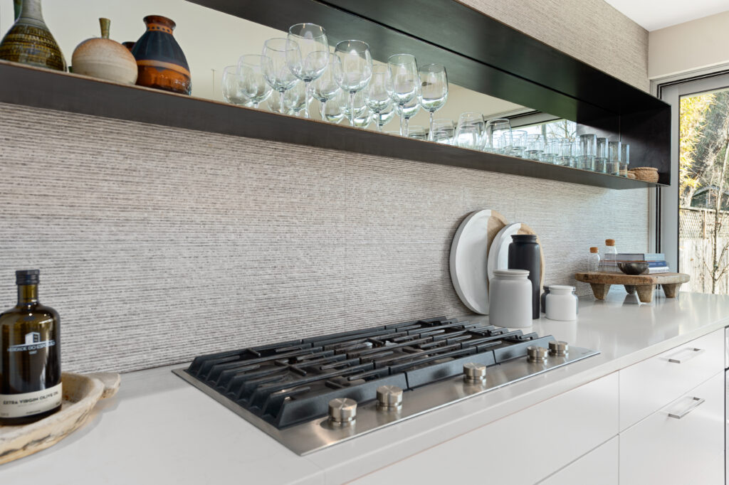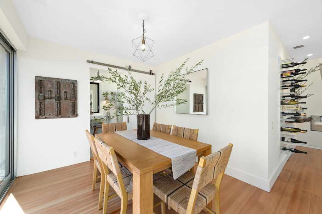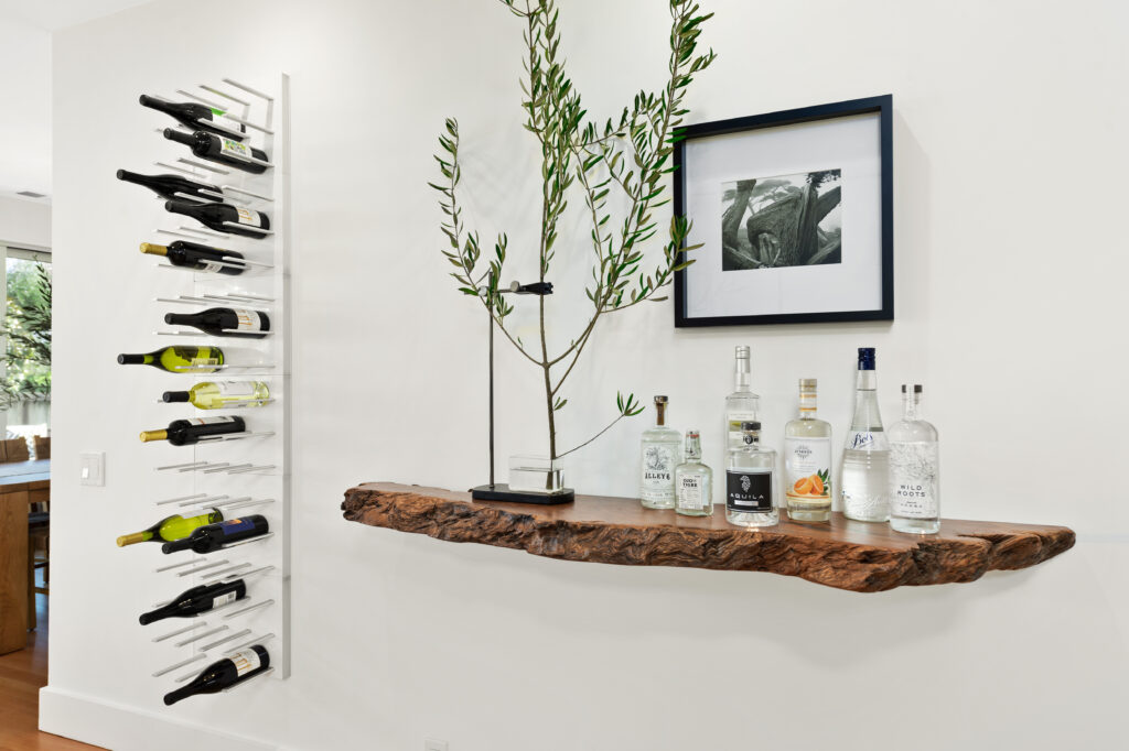 There are other inspired details like a floating raw-edge wood shelf — sourced from Heritage Salvage in Petaluma — that serves as a bar. A branch is artfully displayed via a unique tabletop mount, created by Artifact Design and Salvage in Sonoma.