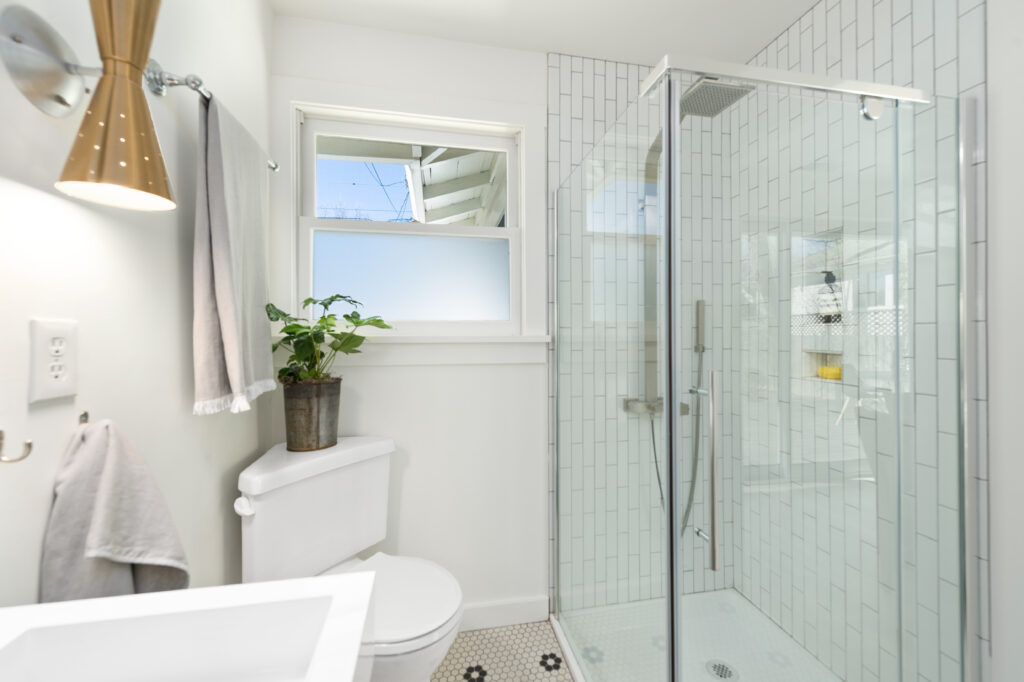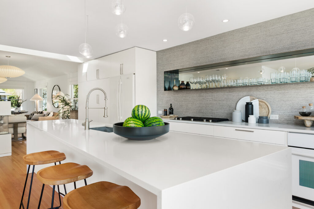 Some design choices were made to keep the space bright. A kitchen glassware shelf has a mirror back that reflects the light. Instead of heavy drapery, the couple chose simple shades to let the sunshine in.
