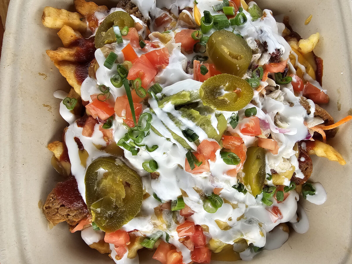 Just over a week after Gordon arrived in Santa Rosa, we rolled up on the lime-green truck parked at 13 W. Third St. for a meat-free feast of fully loaded Mob Fries, greens, candied yams, fried chicken drumsticks, Smackaroni and Soul Mob Rolls that were not just good, but lick-your-fingers and smack-your-lips decadent. The fries, loaded with vegan hot links, nacho sauce, guacamole, Mob Sauce and sour cream (all vegan), didn’t stand a chance against our flying forks.