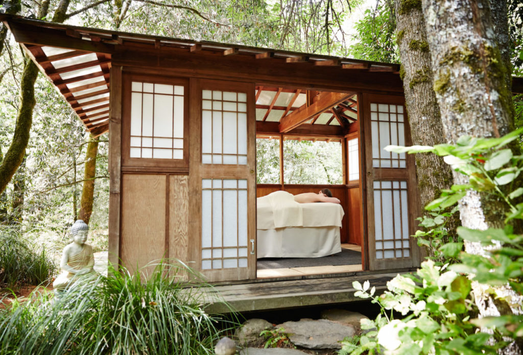 While the cedar enzyme bath ritual takes place inside Osmosis’s spa facilities, the true magic can be found in the surrounding landscape. Guests can book sound therapy treatments in outdoor hammocks, eat lunch at the creekside bistro (proceeds are donated to local nonprofit Ceres Community Project), enjoy a 75-minute massage in a forest pagoda, wander through a bamboo forest, and relax post-treatment in one of several tranquil garden areas, including the crown jewel: the Meditation Garden.
