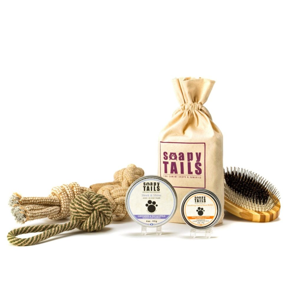 For the dog parent: Here are some coiffing essentials for the pampered pup: bar shampoo, leave-in conditioner and paw pad balm! Dog owners will appreciate your remembering their best friend. (Brush and pull toys not included.) $18, Soap Cauldron, soapcauldon.com