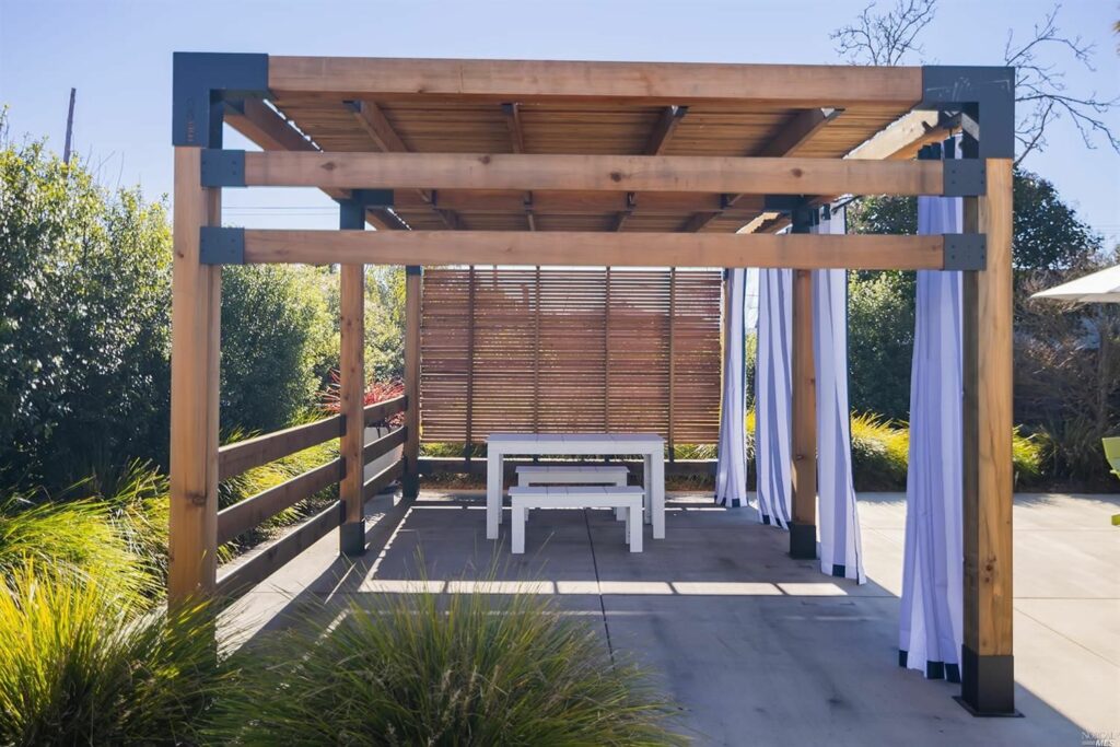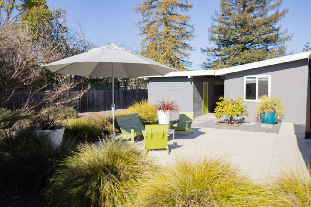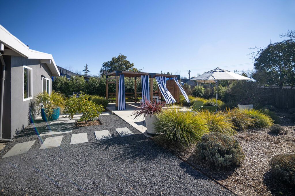 The backyard is anchored by a clean-lined rectangular pergola — made from a kit the couple purchased. Bold, striped outdoor curtains hang from the structure and add style and some extra shade. Lemon and fig trees in the yard infuse life into the otherwise sleek modern landscape that features spaced apart plants with linear leaves — a configuration that is often used these days for its fire-resilient properties.