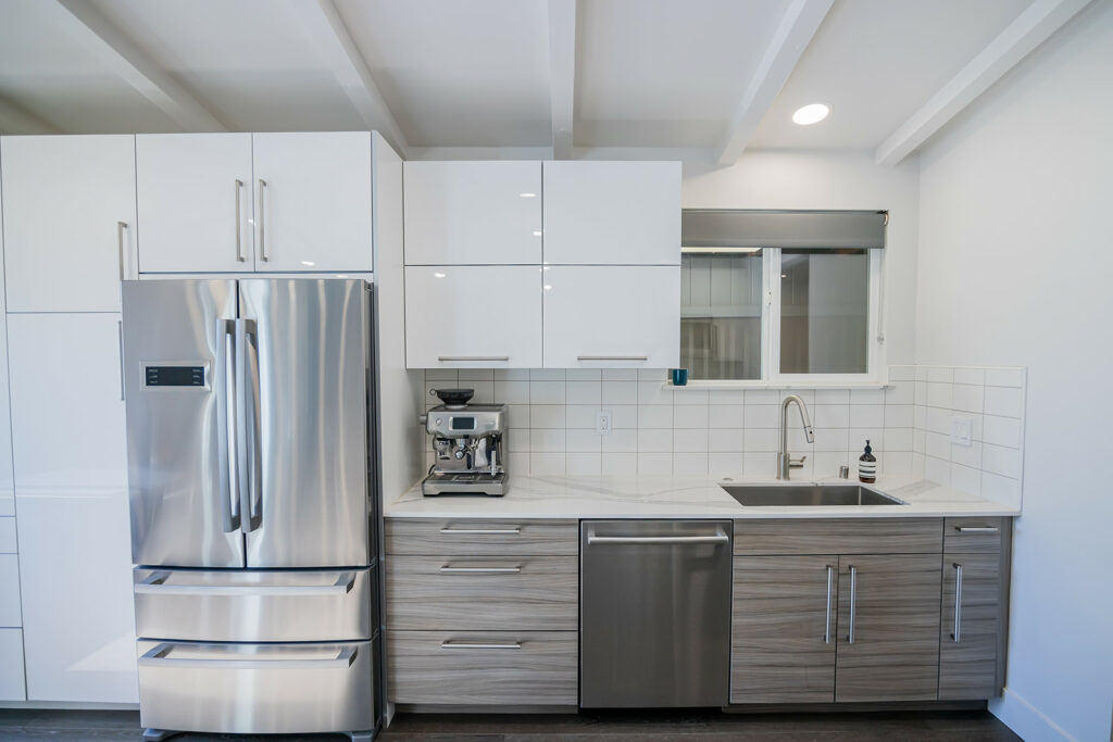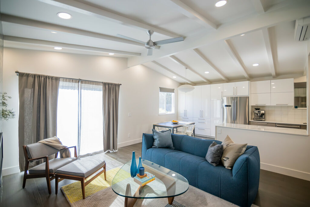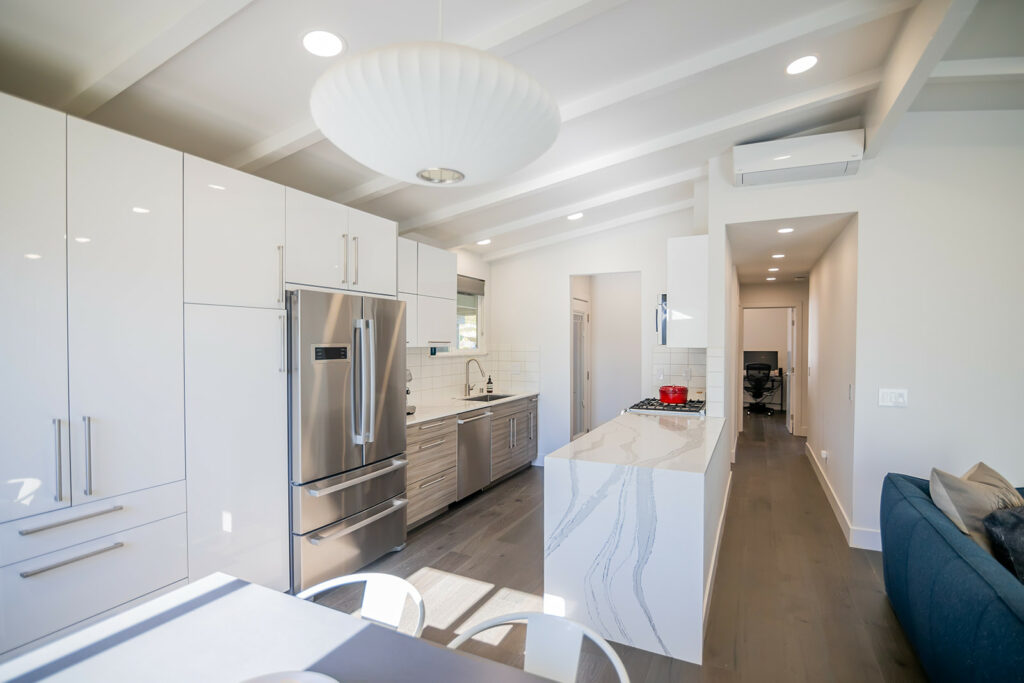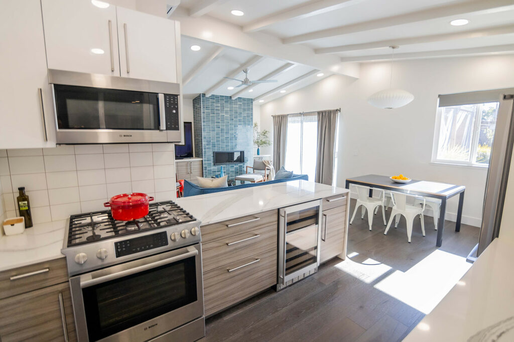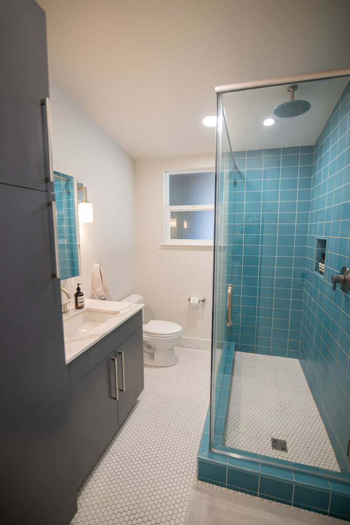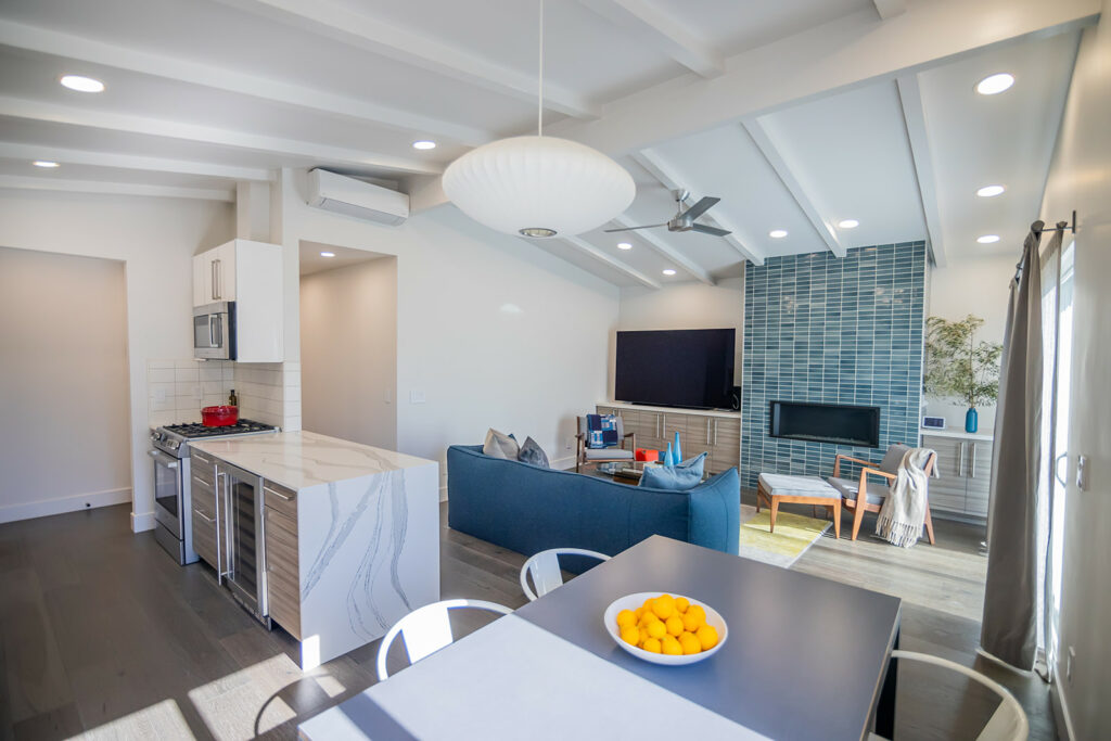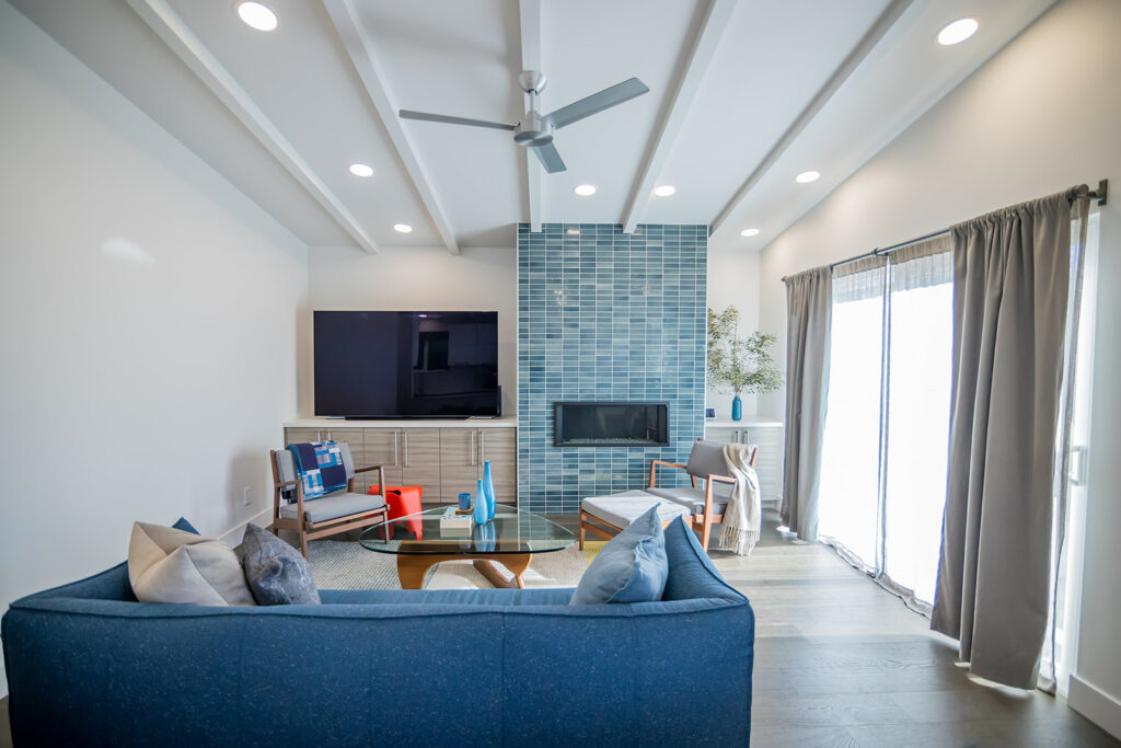 In the kitchen, a veined quartzite waterfall counter and a modern Danish pendant lamp stand out, while new and shiny appliances complete the sleek look. The kitchen-dining area connects with the living room, where a new gas fireplace sits in the hearth. The hearth has been spectacularly accentuated with the use of handmade, ocean-blue tiles from Sausalito-based Heath Ceramics, which designs and builds ceramic homewares in a San Francisco studio.