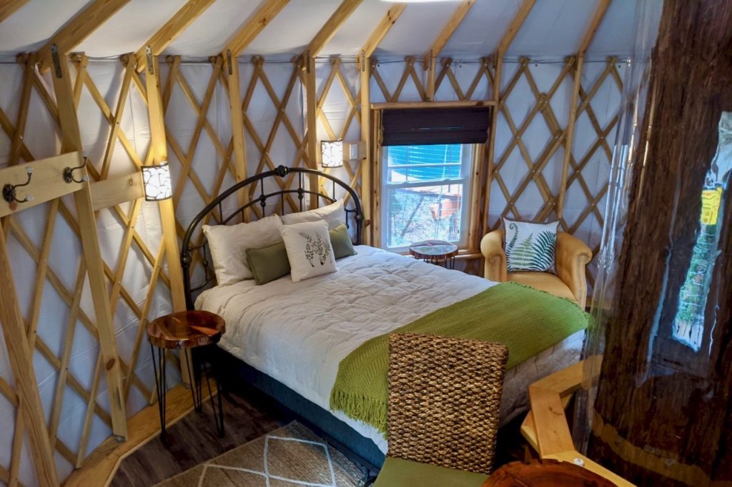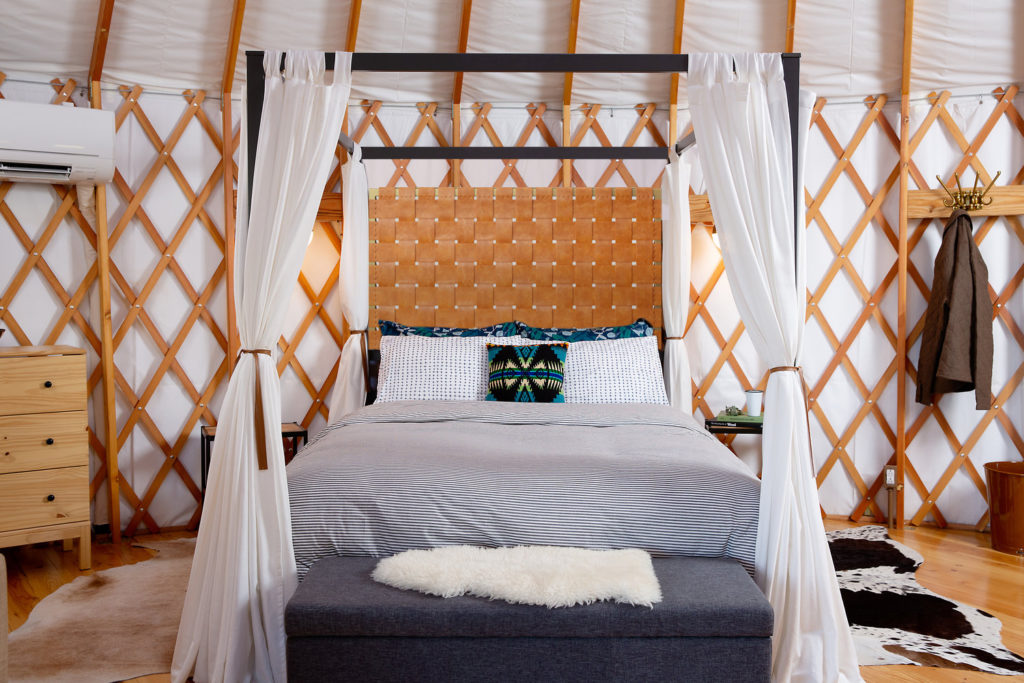 Boon Hotel & Spa glampers enjoy queen platform beds with organic linens, lanterns and boon breakfasts. There’s also electrical outlets to charge all those gadgets we travel with these days. (Courtesy of Boon Hotel & Spa)