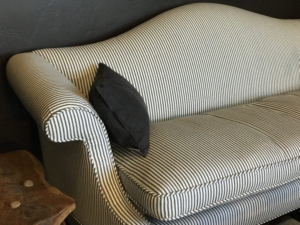 And why dismiss ticking as an outdated, overdone attempt at nostalgia, when you can cover a vintage couch in it, put a modern raw-edge wood end table beside it and make customers feel they suddenly have to have ticking?