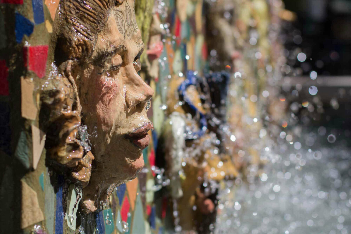 In the middle of Petaluma’s Theatre District is a water fountain covered in more than 800 unique faces made of clay and set in colorful mosaic tile. Ceramic artist and community organizer Donna Billick designed and led the public art project, which welcomed Petalumans of all ages to sculpt self-portraits from clay.