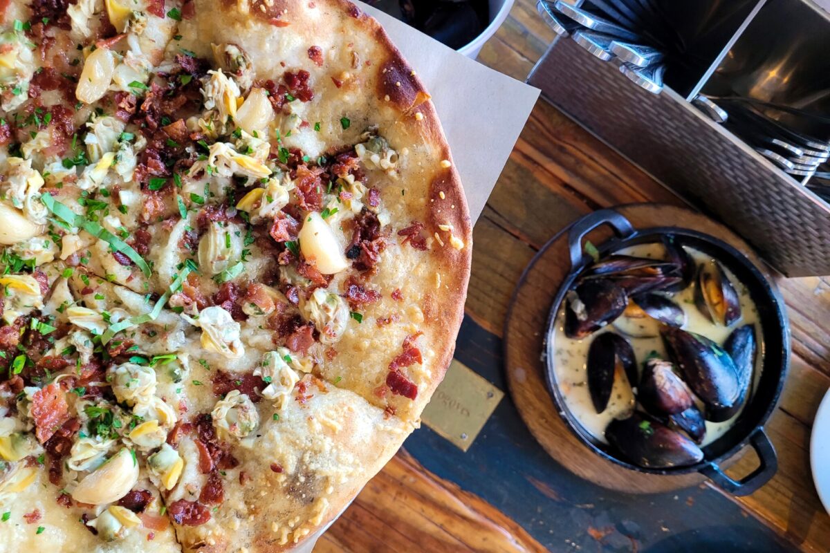 Smoked clam flatbread and mussels are worth tucking in to at Gourmet Au Bay in Bodega Bay. (Heather Irwin/The Press Democrat)