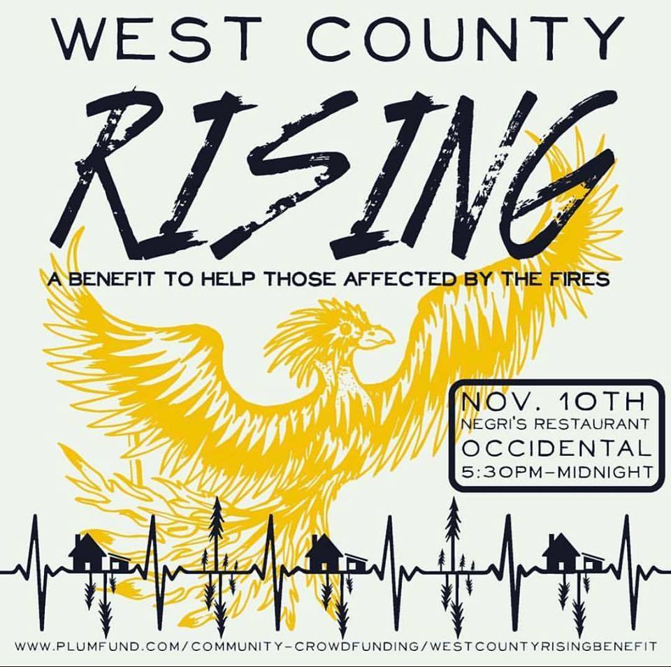 Nov 10 - West County Rising, Occidental, 5:30PM: Negri's Italian Dinners & Joe's Bar in Occidental is bringing together the West Count community to raise money and gifts for low-income families and families affected by the Sonoma County fires. The benefit will feature a spaghetti dinner, live music, dance party and silent auction. Tickets are available online or at the door by sliding scale. 3700 Bohemian Hwy