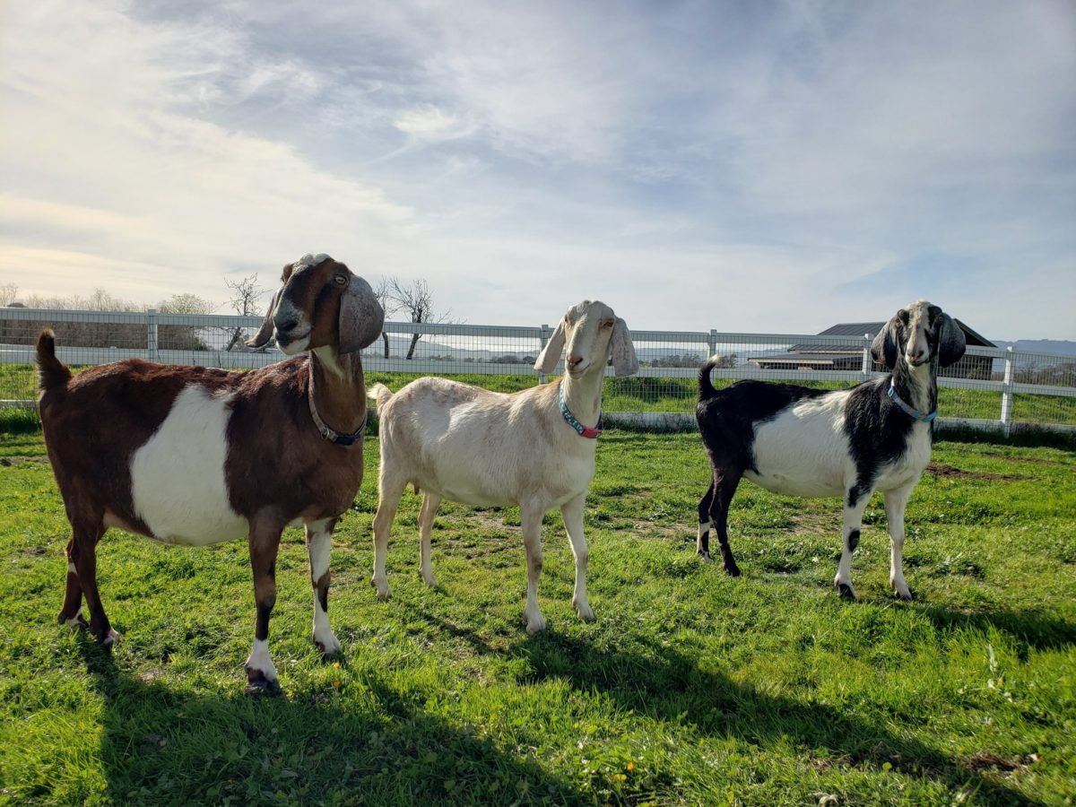 Three goats striking a pose at Charlie's Acres in Sonoma. (Charlie's Acres)