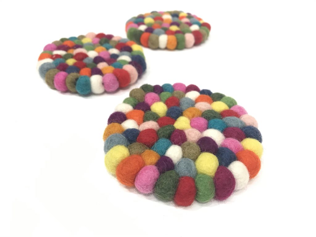 Colorful Coverage: Absorbent natural wool balls come playfully together to protect beautiful wood furniture from beautiful sweaty drinks. These Fair Trade coasters are made in Nepal. $8 (each), Global Heart Fair Trade, 423 1st St. W, Sonoma, 707-939-2847, globalheartfairtrade.com.