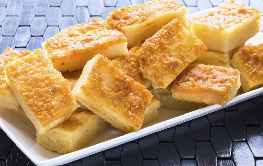 Let cool to room temperature, cut into squares, and arrange on a platter. Enjoy right away or refrigerate, covered, until 30 minutes before serving. Butter mochi will keep refrigerated for about three days.