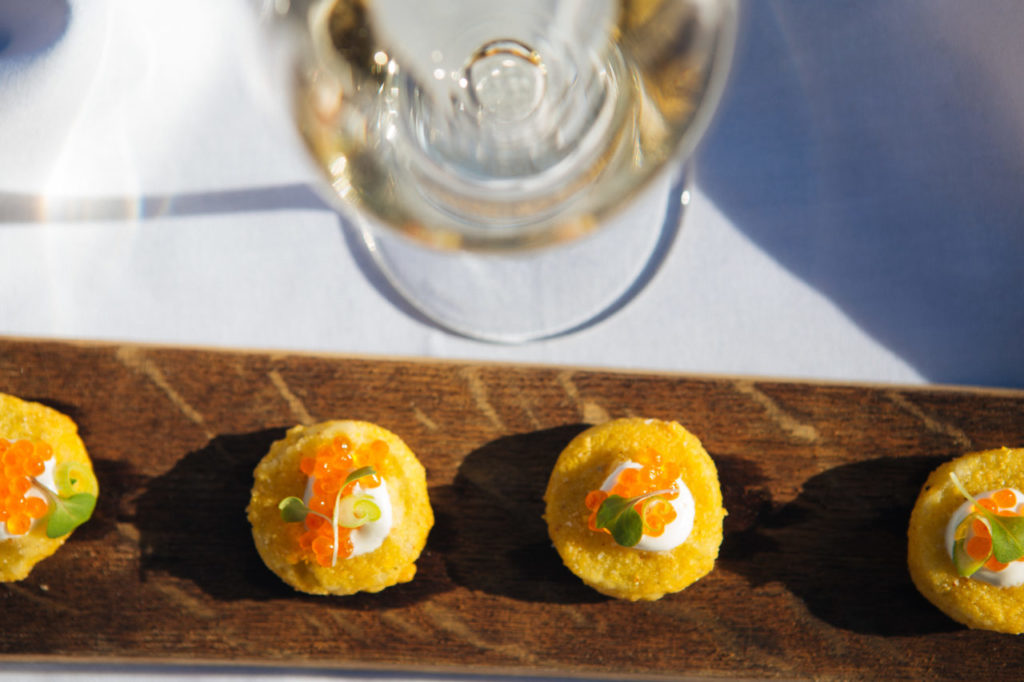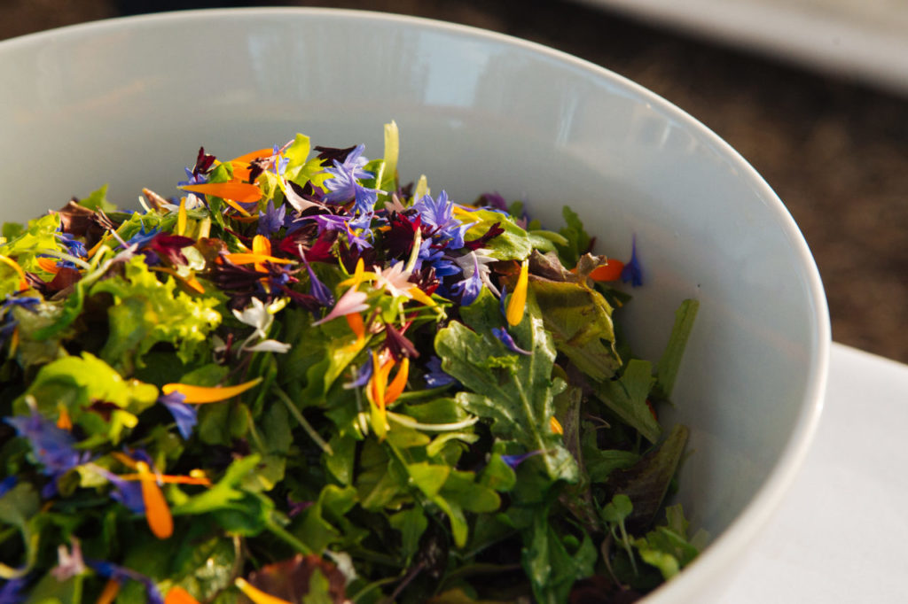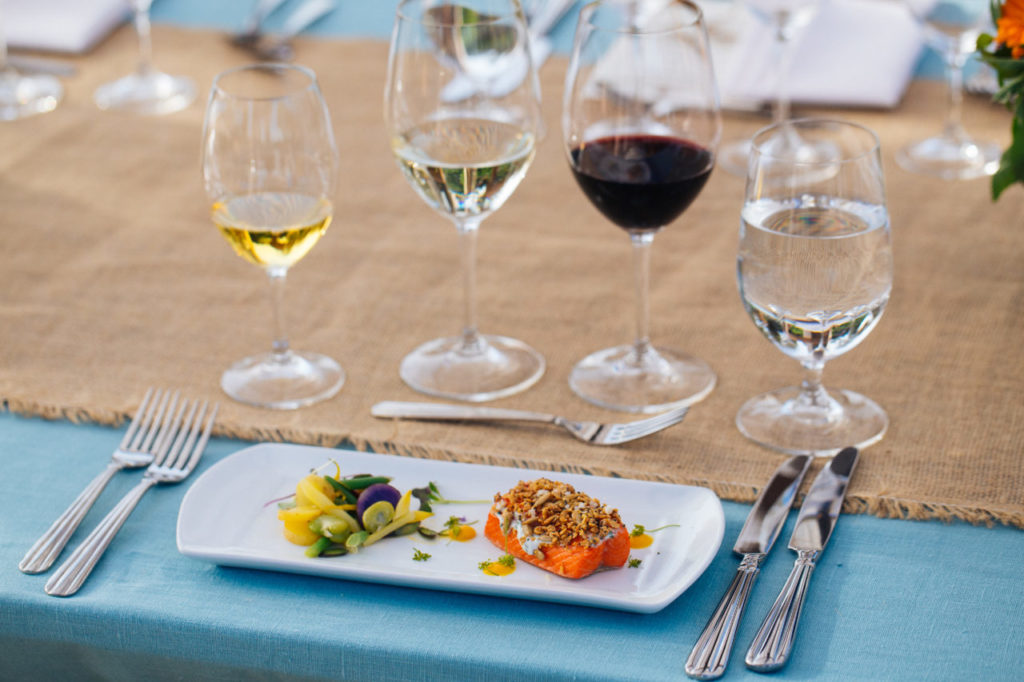 Dinner is then served at an expansive outdoor table, set between plots of carrots and leeks. The first course is a salad, which combines the featured food purveyor’s offerings and the winery’s seasonal produce. In June, for example, the winery teams up with sustainable seafood company Costarella Seafoods. Costarella’s cured salmon will be paired with trout caviar, and beets, dill, and ice lettuce from the winery gardens.