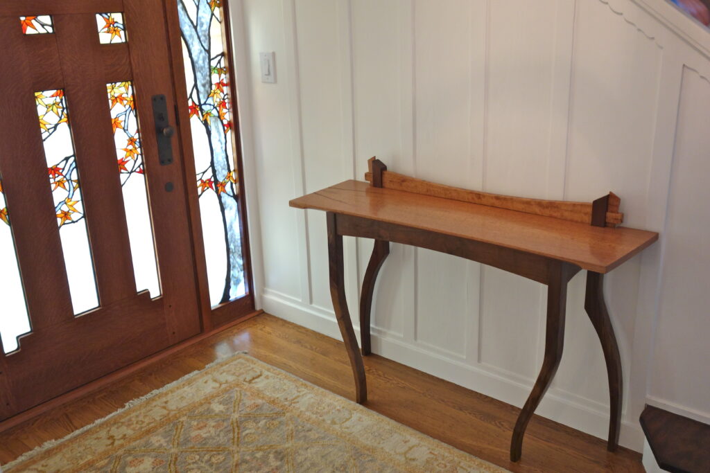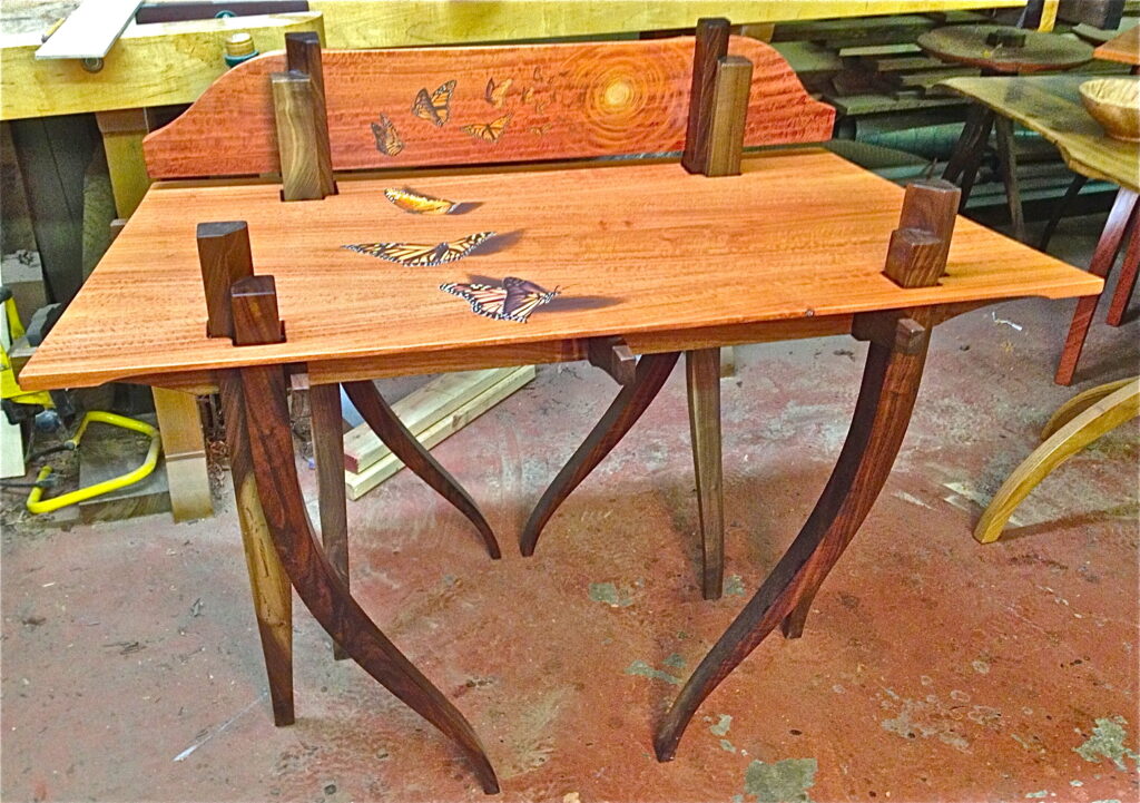 Palace’s muse is leftover wood on construction sites. “People treat wood like it’s garbage,” he said. He collects the discarded lumber and then creates furniture from it. He likes to “resurrect (fallen) trees into art,” he said. Over the years, he’s collected not only lumber but a library of books on the history of furniture design and joinery.