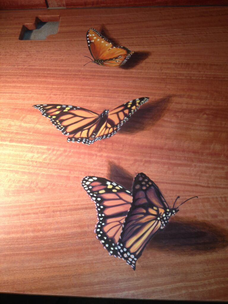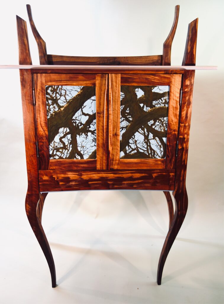 The Sonoma artist occasionally uses his painting skills when creating furniture. One desk, entitled Fragile As a Forest, has been adorned with hyperrealistic butterflies that look as though they just landed on the wood. Another cabinet has trees on its doors that appear to be reflected in glass.