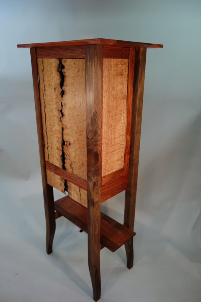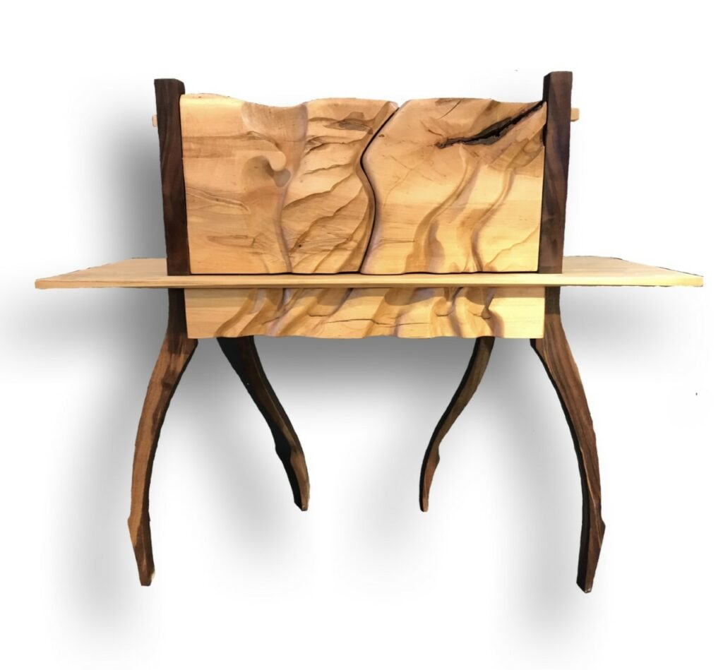 The grains, textures and hues of the wood provide the “color” for Palace’s furniture pieces. He creates contrast in each piece by using woods in a variety of colors, from the ruddy red of the eucalyptus to the honey tones of the maple. He then carves wood overlays into what he calls “erosion patterns.”