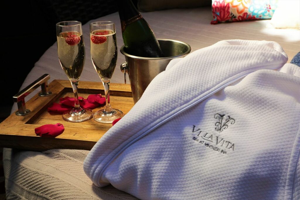 Celebrate Romance at Vintners Resort in Santa Rosa: Why just get away for one night, when you can be surrounded by vineyard views for two? Silk rose petals will be scattered about the room and a bottle of Gloria Ferrer Private Cuveé Brut and six chocolate-dipped strawberries will be waiting when you arrive. Along with two 50-minute massages and spa robes that are yours to keep, the package includes a $150 dining credit valid at all of the resort’s restaurants. Rates start at $1073. 4350 Barnes Road, Santa Rosa, 707-800-421-2584, vintnersresort.com (Courtesy of Vintners Resort)