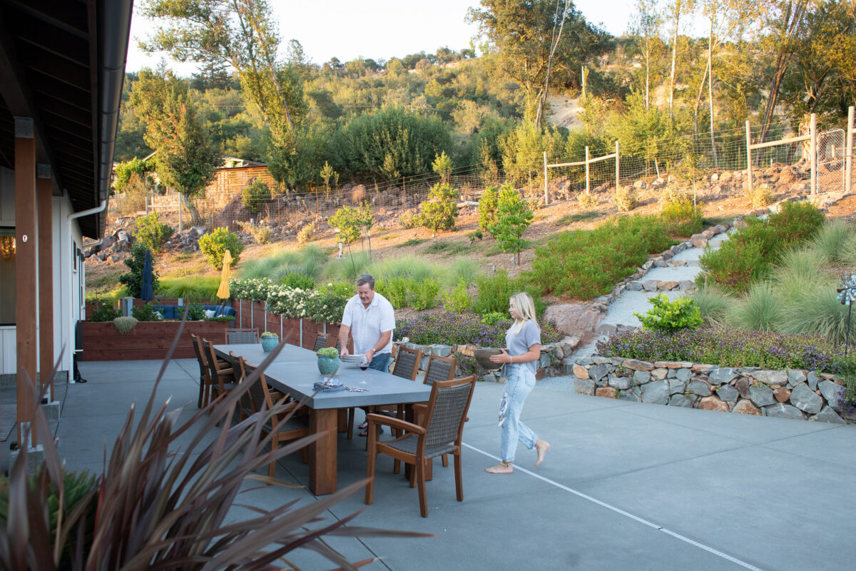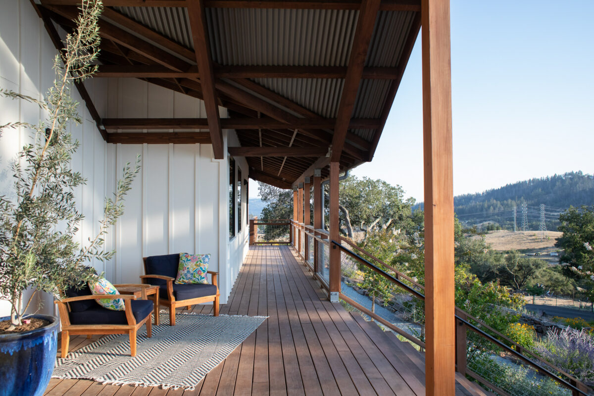 Howe and Marks often sit on the porch in the evening, sipping glasses of wine and watching the sun set. From here they also have a bird’s-eye view of two of the property’s three paddocks. Marks says she “feeds her soul” walking among the rebuilt, terraced gardens, now filled with pollinator-friendly plants and new fruit trees. Another favorite hangout spot is the pool deck, where the couple take in the views, chat about their day, and listen to birds and animals. From the hot tub, they can watch bats skim the pool for bugs.