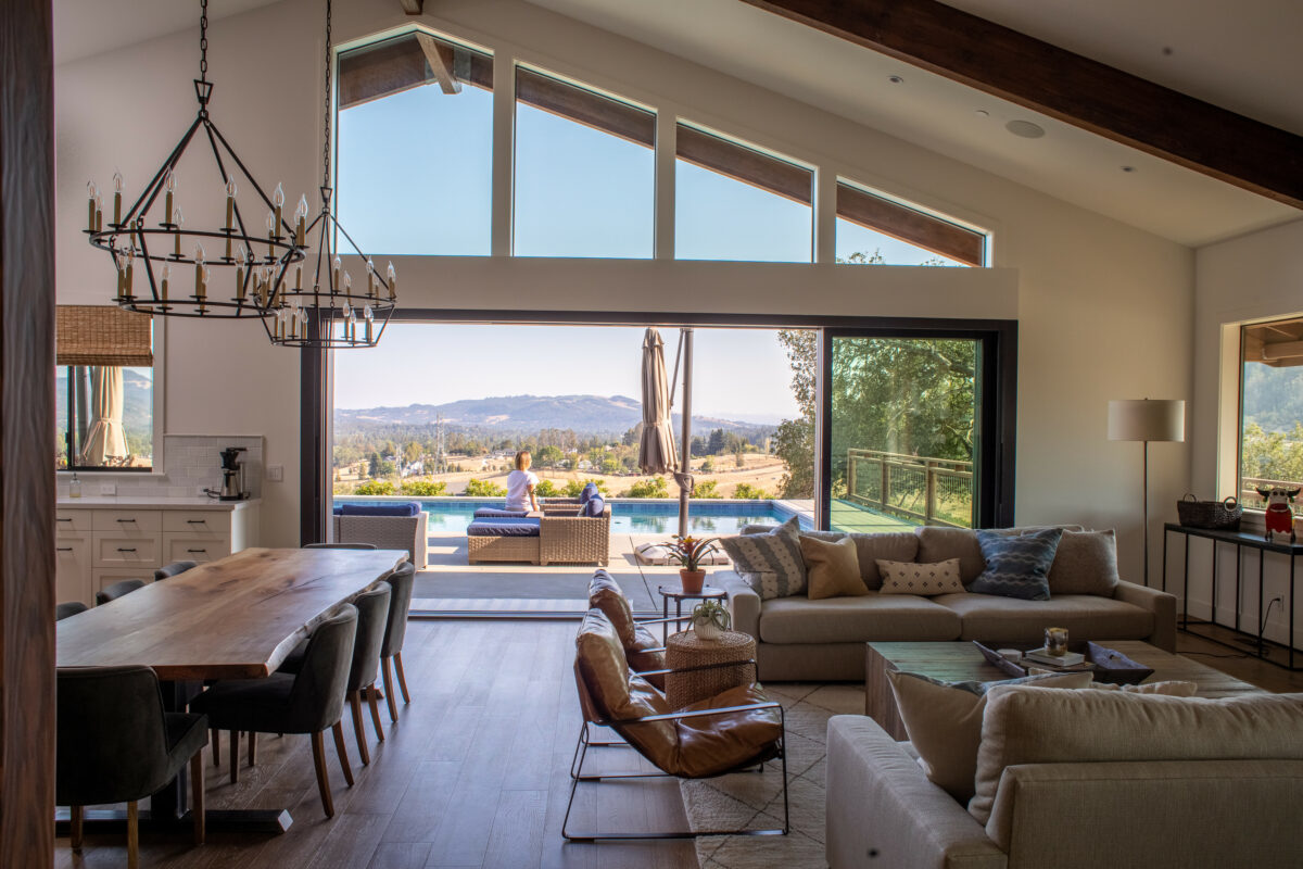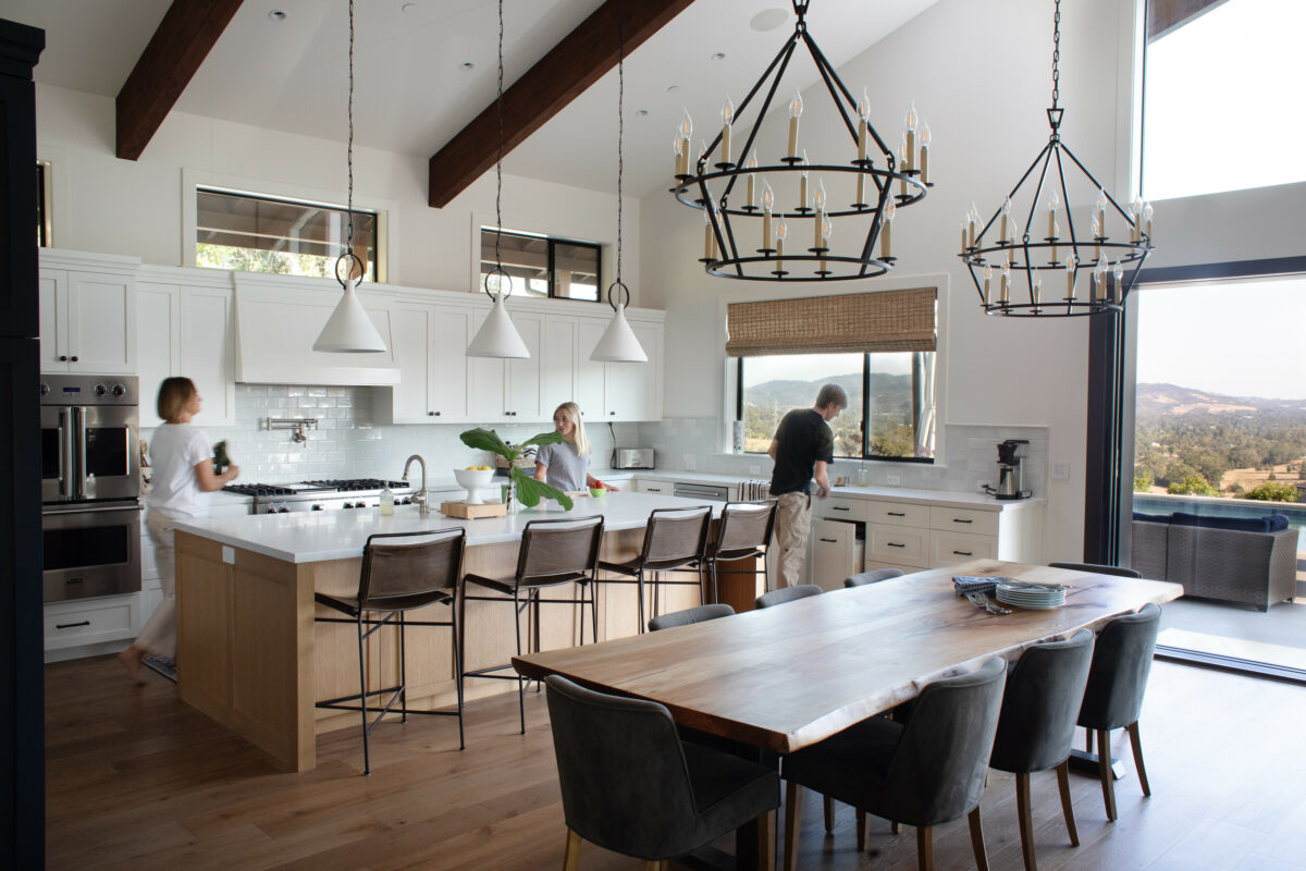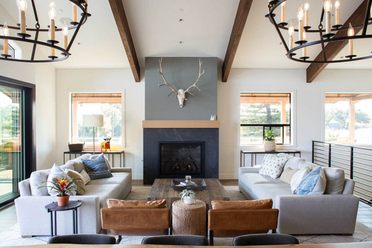 A 20-foot dining table, built out of sycamore by Jesse Almos of Sonoma Woodworks, anchors the dining area, next to a large, family-friendly kitchen with a quartz-topped island. In the living room, the defining feature is an elk skull above a new gas fireplace.