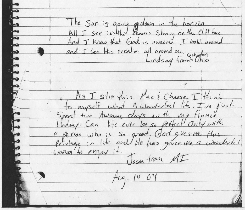 Jason wrote: “As I stir this Mac & Cheese I think to myself what a wonderful life. I’ve just spent two awsome (sic) days with my fiance Lindsay. Can life ever be so perfect. Only with a person who is so great. God gives me this privilege in life and He has given me a wonderful woman to enjoy it.”