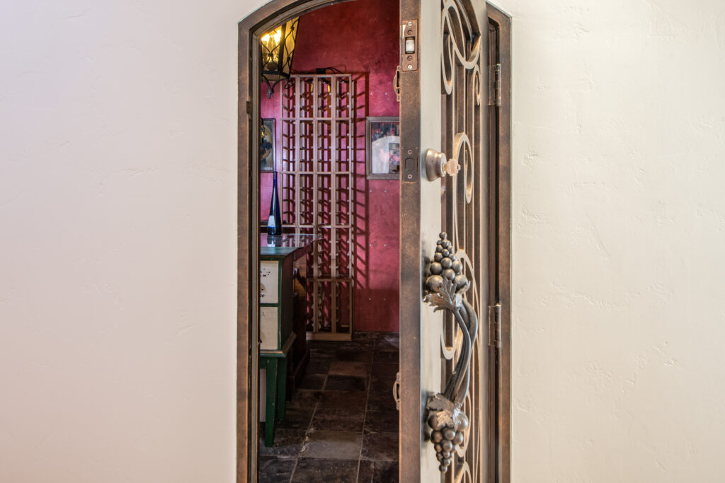 The windows are framed in rustic stained wood. This material has also been used in the oversized doors and in the built-in cabinetry in the library and kitchen. The warm wood has been ornamented with wrought iron door handles and scrollwork — the door to the wine cellar includes forged grapes. Lots of travertine tile has been incorporated throughout the home.