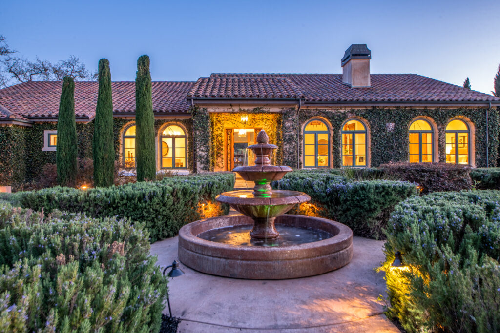 Climbing ivy adorns the front of the home and a large four-tier fountain fit for an Italian villa stands in the center of the front yard. The landscape is kept simple and green with rows of ever-so-Mediterranean Italian cypress, plus hedges and balls of rosemary, lavender and other plants.