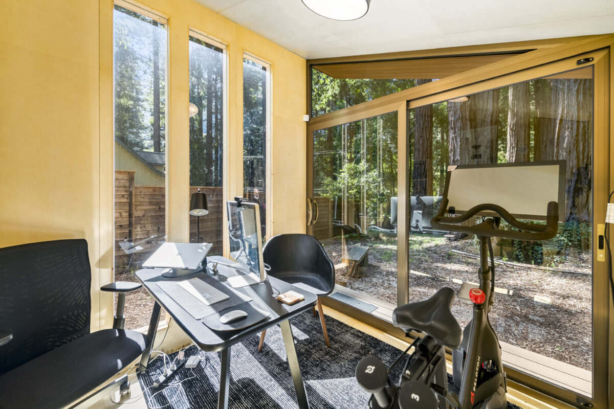 An additional building with a single-sloped roof and walls of windows serve as a sun-drenched space to work, workout or retreat to.
